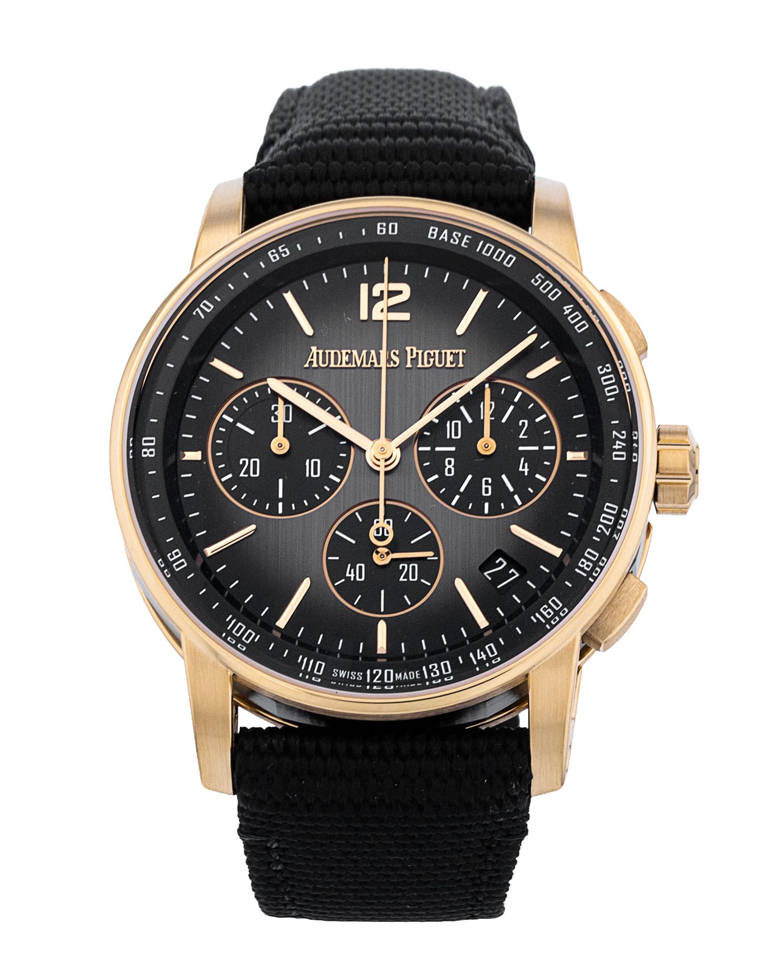 This Audemars Piguet CODE 11.59 26393NR.OO.A002KB.01 has a black dial and a fabric strap. This Audemars Piguet has undergone a thorough inspection of accuracy, functionality and condition at our Audemars Piguet certified service centre to determine the level of reconditioning required to meet our strict standards. It has also been checked against our records to ensure authenticity. All our watches have a 24-month warranty for your peace of mind.