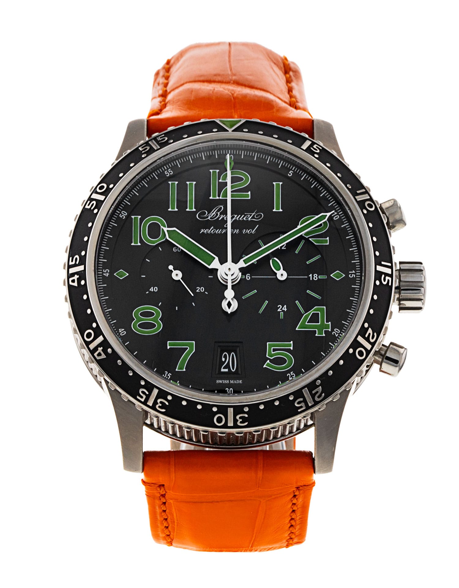 This Breguet Type XX 3815TI/HM/3ZU has a black arabic dial and a leather strap. This Breguet has undergone a thorough inspection of water resistance, accuracy, functionality and condition to determine the level of reconditioning required to meet our strict standards. It has also been referenced against technical documents and manufacturer records where available to ensure authenticity and a clean history. Our watches have a 24-month warranty for your peace of mind, in conjunction with any remaining manufacturer’s warranty from new or from service.