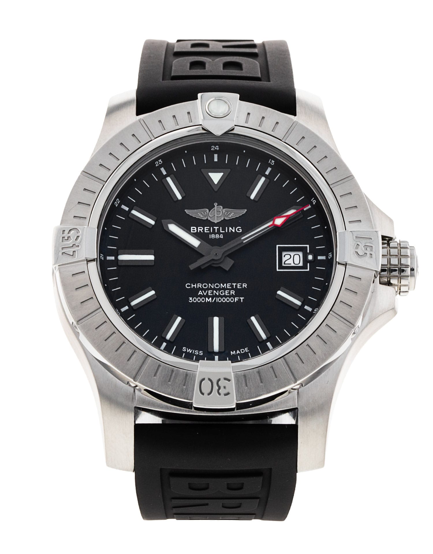 This Breitling Avenger Automatic 45 A17319 has a black baton dial and a rubber strap. This Breitling has undergone a thorough inspection of water resistance, accuracy, functionality and condition to determine the level of reconditioning required to meet our strict standards. It has also been referenced against technical documents and manufacturer records where available to ensure authenticity and a clean history. All our watches have a 24-month warranty for your peace of mind.