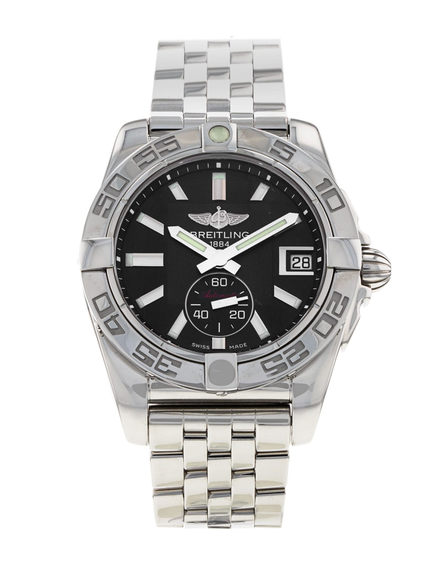 This Breitling Galactic 36 Automatic A37330 has a black diamond dial and a bracelet strap. This Breitling has undergone a thorough inspection of water resistance, accuracy, functionality and condition to determine the level of reconditioning required to meet our strict standards. It has also been referenced against technical documents and manufacturer records where available to ensure authenticity and a clean history. All our watches have a 24-month warranty for your peace of mind.