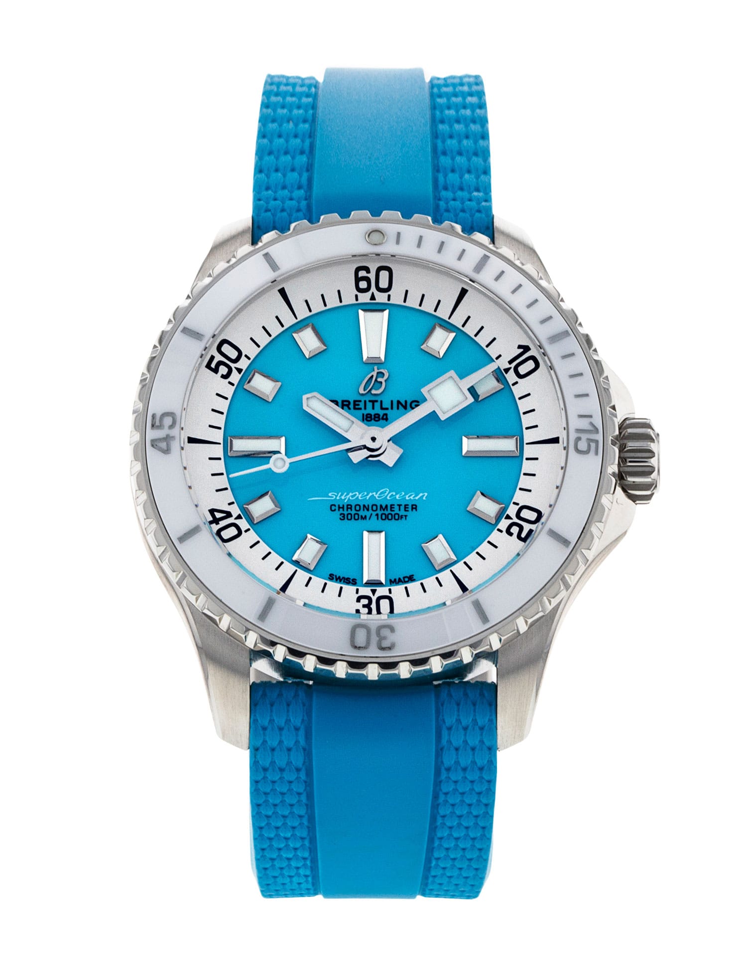 This Breitling SuperOcean Automatic 36 A17377 has a turquoise dial and a rubber strap. This Breitling has undergone a thorough inspection of water resistance, accuracy, functionality and condition to determine the level of reconditioning required to meet our strict standards. It has also been referenced against technical documents and manufacturer records where available to ensure authenticity and a clean history. All our watches have a 24-month warranty for your peace of mind.