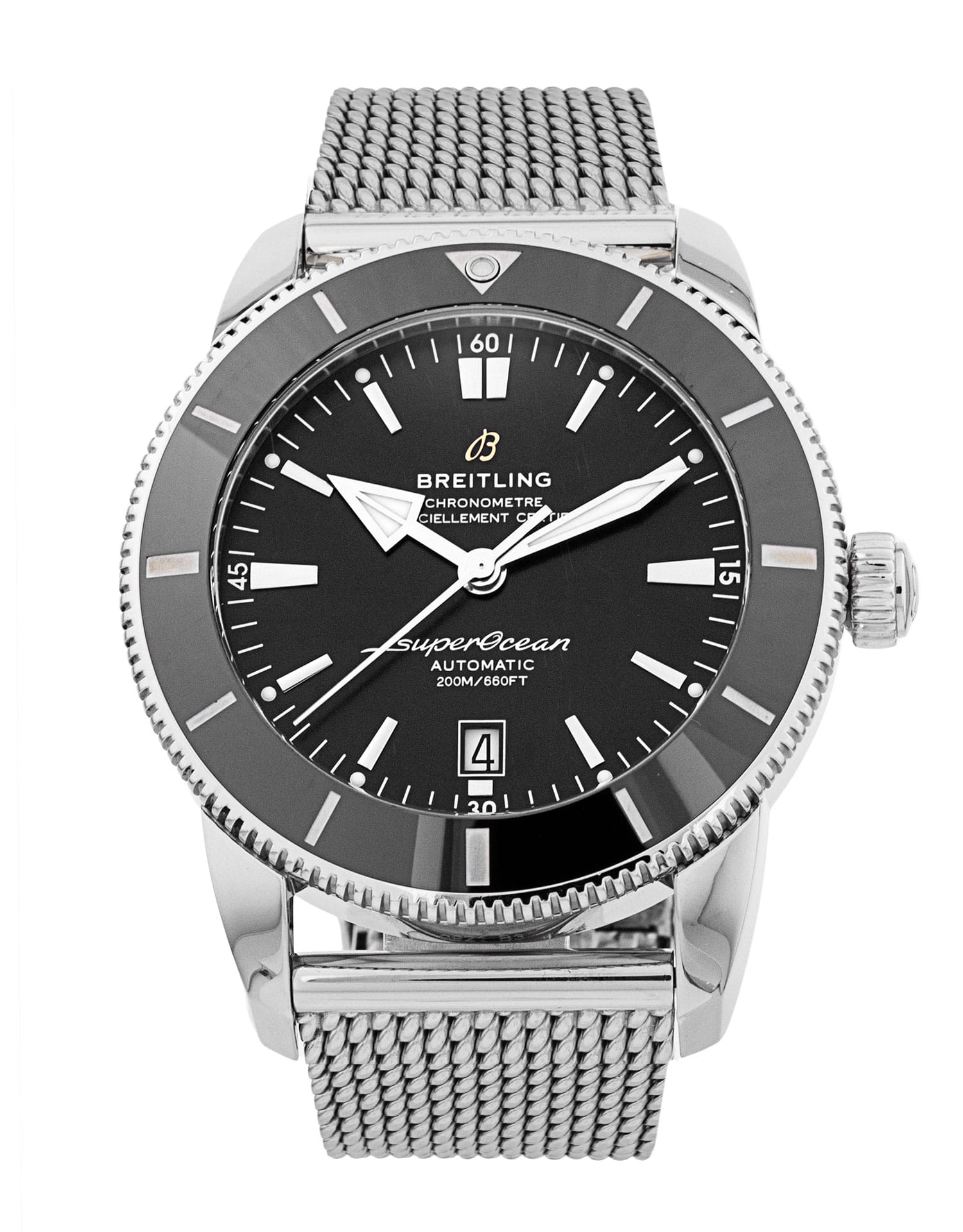This Breitling SuperOcean Heritage B20 Automatic 46 AB2020 has a black baton dial and a bracelet strap. This Breitling has undergone a thorough inspection of water resistance, accuracy, functionality and condition to determine the level of reconditioning required to meet our strict standards. It has also been referenced against technical documents and manufacturer records where available to ensure authenticity and a clean history. All our watches have a 24-month warranty for your peace of mind.