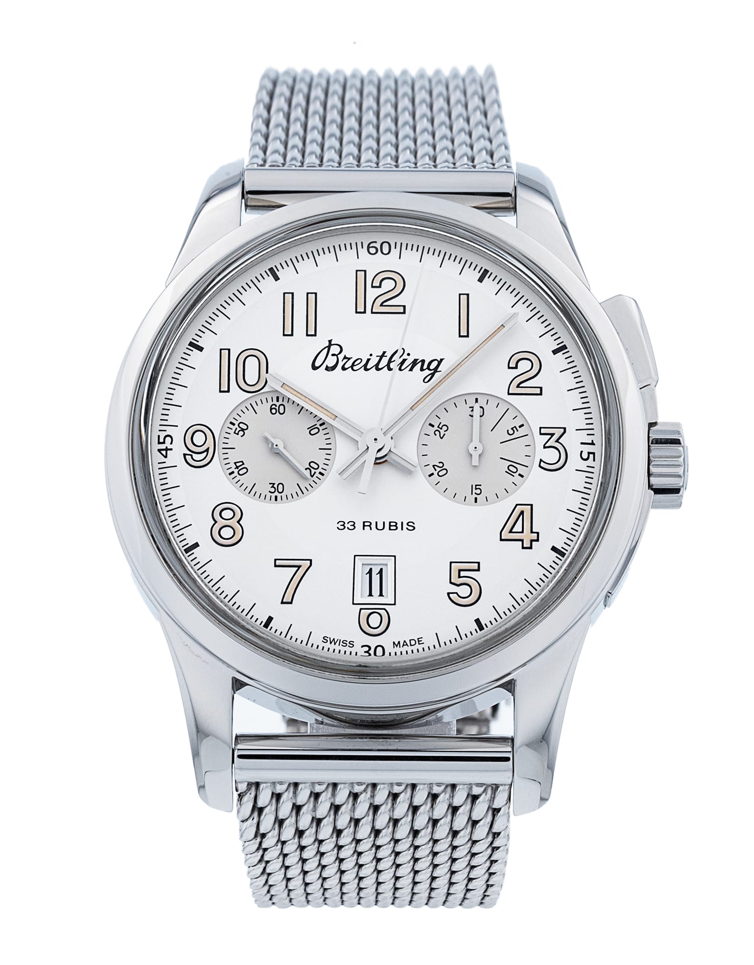 This Breitling Transocean Chronograph AB1411 has a silver arabic dial and a bracelet strap. This Breitling has undergone a thorough inspection of water resistance, accuracy, functionality and condition to determine the level of reconditioning required to meet our strict standards. It has also been referenced against technical documents and manufacturer records where available to ensure authenticity and a clean history. All our watches have a 24-month warranty for your peace of mind.