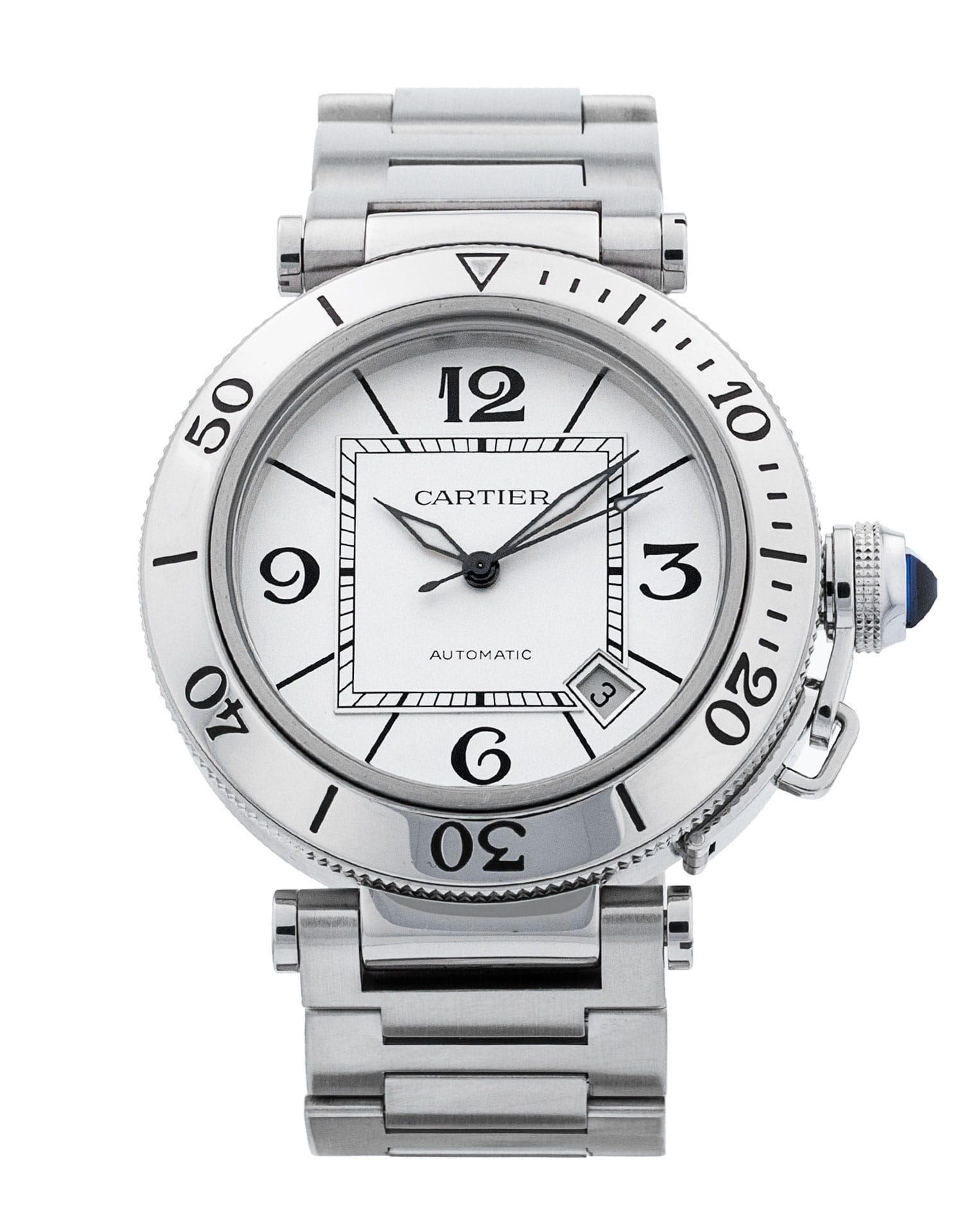 This Cartier Pasha W31080M7 has a silver quarter arabic dial and a bracelet strap. This Cartier has undergone a thorough inspection of accuracy, functionality and condition at our Cartier certified service centre to determine the level of reconditioning required to meet our strict standards. It has also been checked against our records to ensure authenticity. All our watches have a 24-month warranty for your peace of mind.