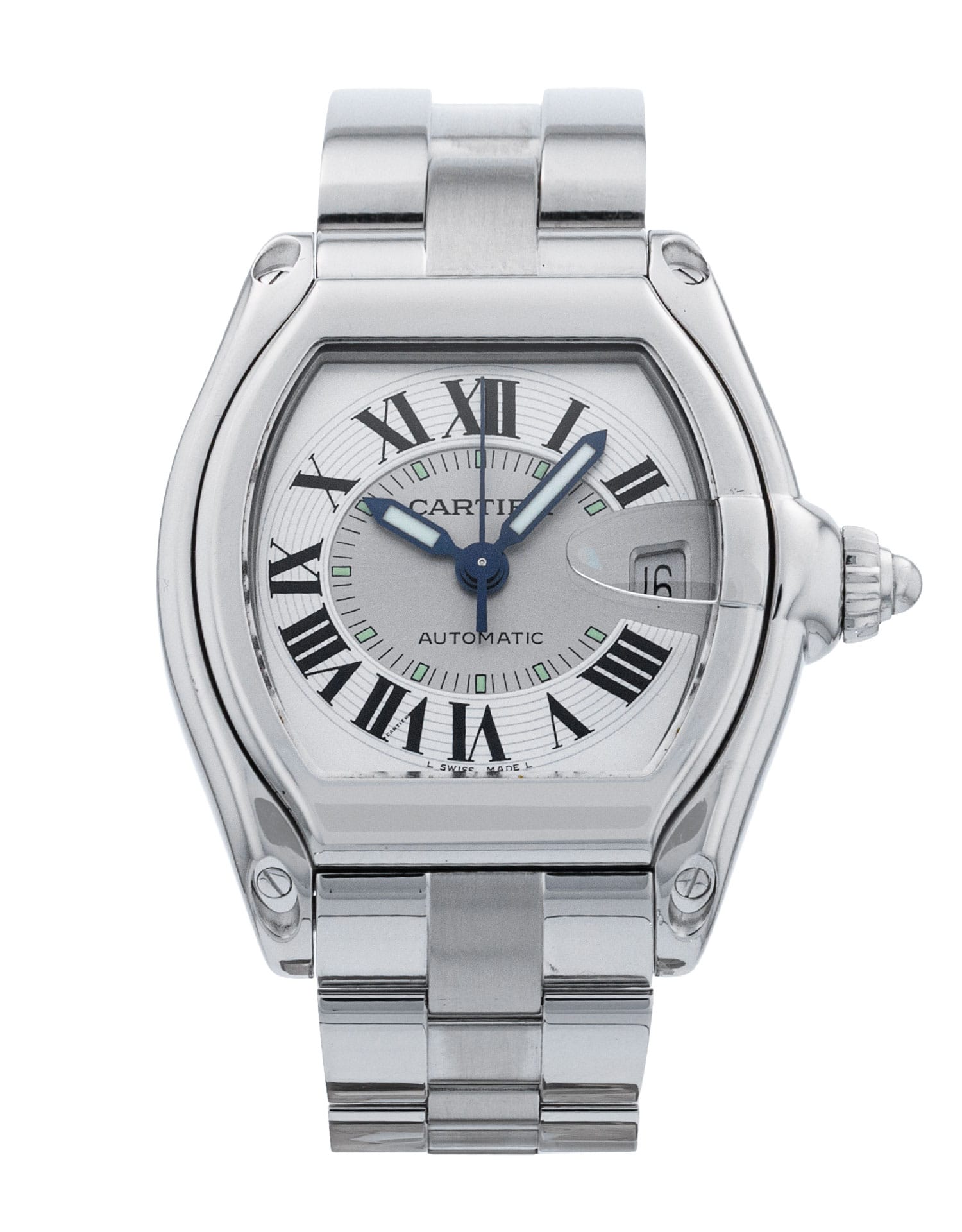 This Cartier Roadster W62000V3 has a silver roman numeral dial and a bracelet strap. This Cartier has undergone a thorough inspection of accuracy, functionality and condition at our Cartier certified service centre to determine the level of reconditioning required to meet our strict standards. It has also been checked against our records to ensure authenticity. All our watches have a 24-month warranty for your peace of mind.