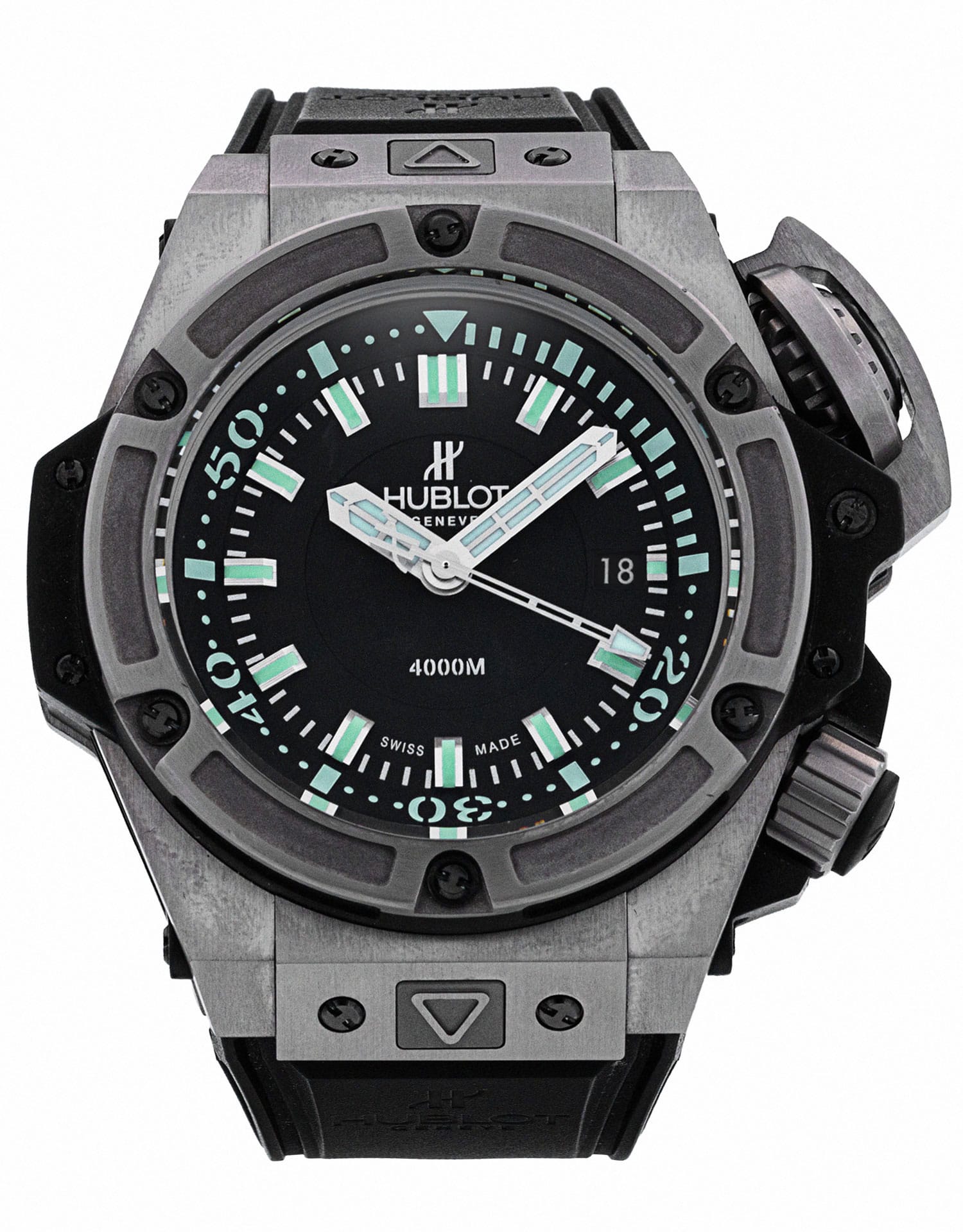 Given the Big Bang's origins, with its porthole-inspired design, there have been nautical themes in the collection from the start—if faint ones. So when it came time for Hublot to create its first “serious” diving watch, it made some sense to turn to the King Power, the even bigger, bolder version of the already spectacular Big Bang series. Hublot was never going to do things by halves. Made of lightweight titanium, this “Oceanographic” has a beastly 48mm case distinguished by the monstrous crown at 2 o'clock (its marginally smaller brother at 4 o'clock is for the inner bezel), and a super-legible, lume-heavy dial. The crystal is a massive 6.5mm thick, providing the immense water resistance (4,000m) that would keep this extraordinary watch safe and sound on the ocean floor.