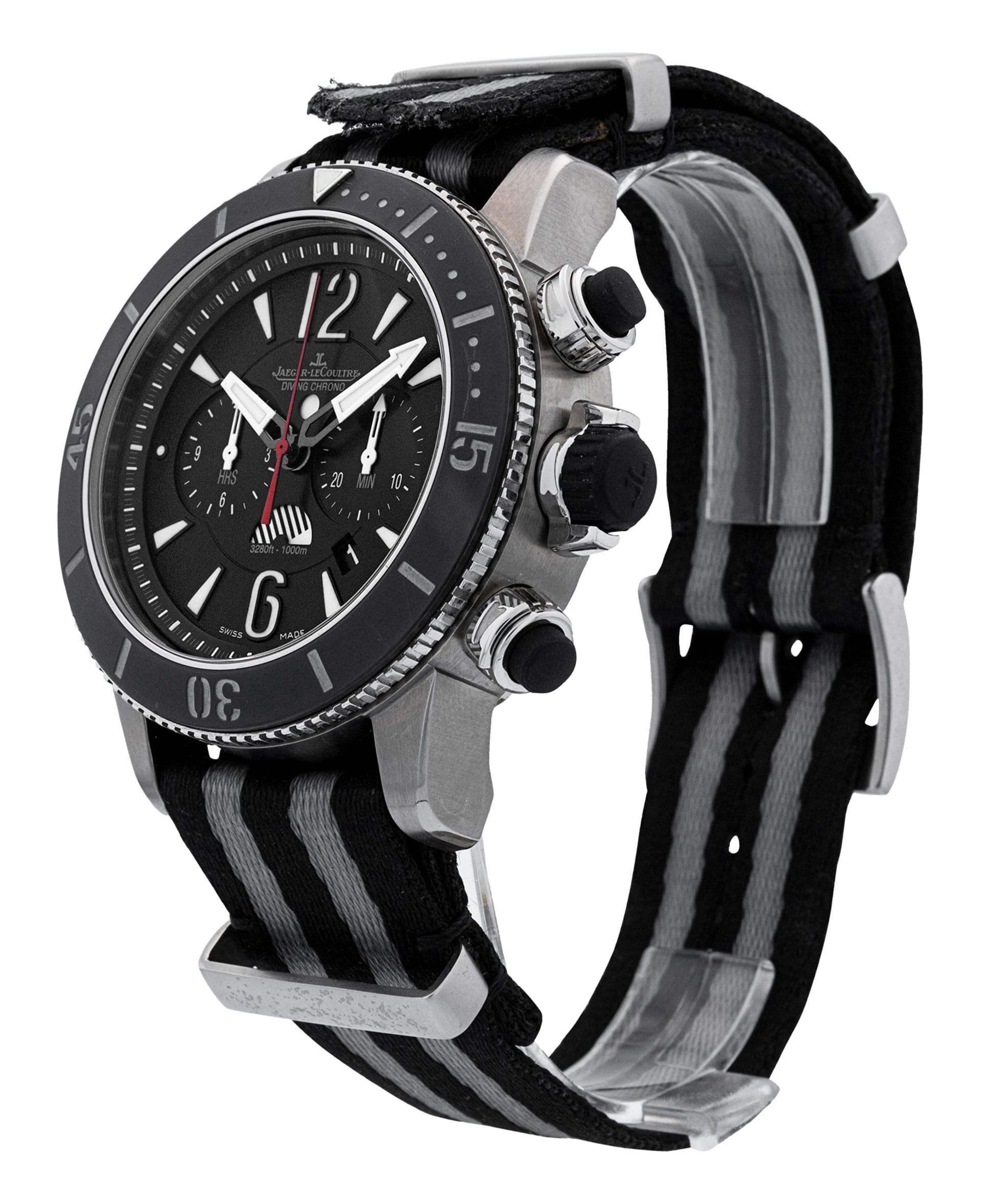 This Jaeger-LeCoultre Master Compressor Diving 178T470 has a black dial and a fabric strap. This Jaeger-LeCoultre has undergone a thorough inspection of accuracy, functionality and condition at our Jaeger-LeCoultre certified service centre to determine the level of reconditioning required to meet our strict standards. It has also been checked against our records to ensure authenticity. All our watches have a 24-month warranty for your peace of mind.