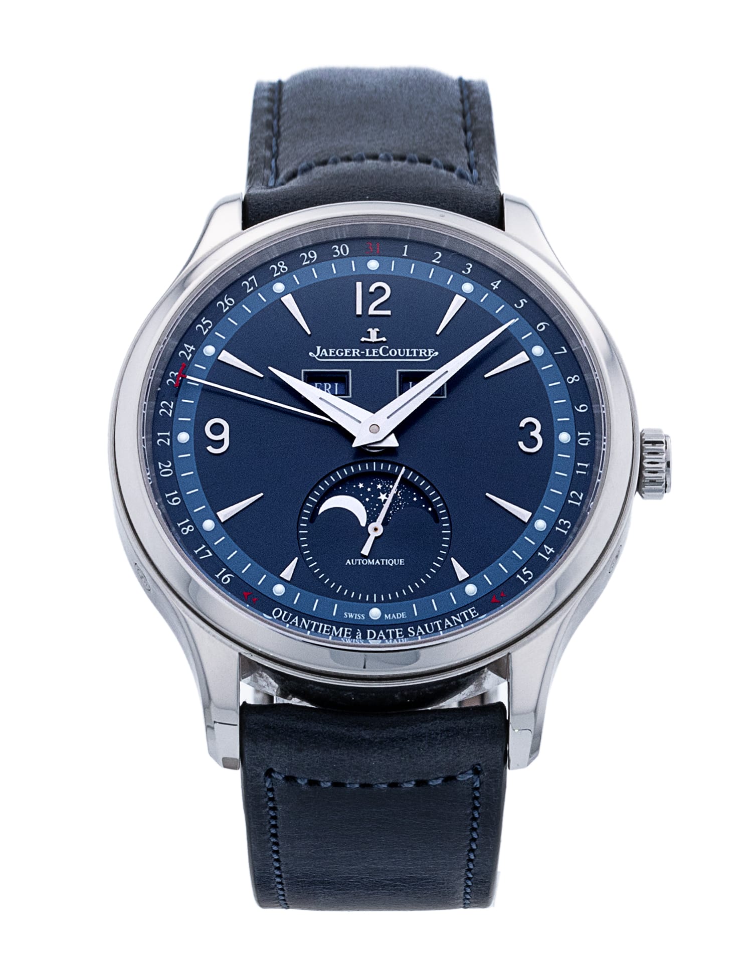 This Jaeger-LeCoultre Master Control 4148480 has a blue quarter arabic dial and a leather strap. This Jaeger-LeCoultre has undergone a thorough inspection of accuracy, functionality and condition at our Jaeger-LeCoultre certified service centre to determine the level of reconditioning required to meet our strict standards. It has also been checked against our records to ensure authenticity. All our watches have a 24-month warranty for your peace of mind.