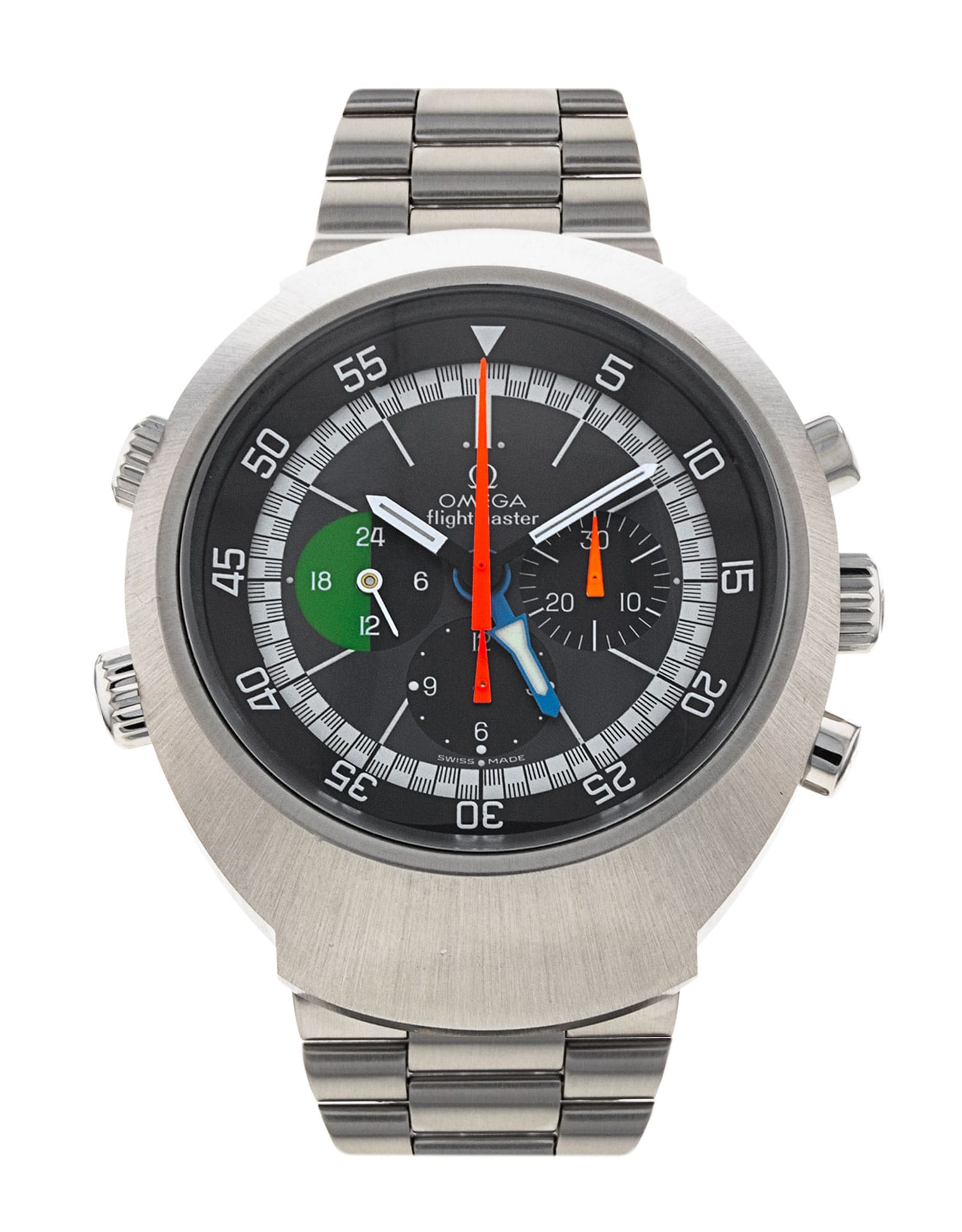 The Flightmaster was launched in 1969 as Omega's watch of the future, the successor to the enormously popular, space-faring Speedmaster, and as the brand's first series targeted specifically at pilots. It featured a new case and striking design that was both totally revolutionary and captured the spirit of the age. Although the Flightmaster itself was discontinued in the early 70s, many of these iconic design elements continue to be used in Omega watches today. This c.910 model is an extraordinary vintage example of what made the Flightmaster so iconic, including the distinctive case with sunburst finish, the colourful displays, and the colour-coded, triple-crown functionality.