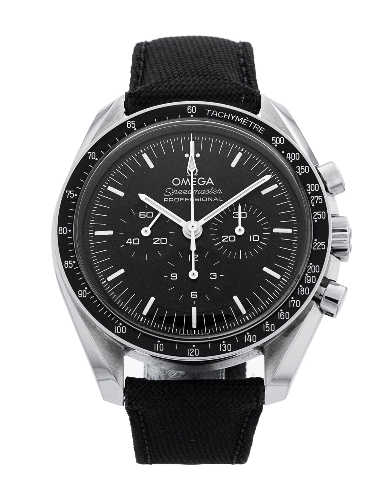 This Omega Speedmaster Moonwatch Professional 310.32.42.50.01.001 has a black baton dial and a fabric strap. This Omega has undergone a thorough inspection of accuracy, functionality and condition at our Omega certified service centre to determine the level of reconditioning required to meet our strict standards. It has also been checked against our records to ensure authenticity. All our watches have a 24-month warranty for your peace of mind.