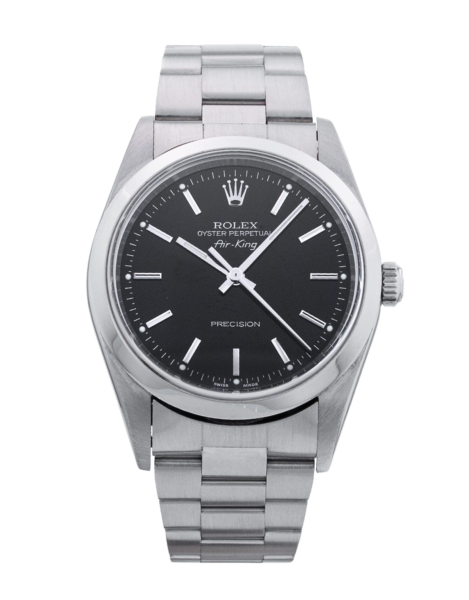 This Rolex Air-King 14000M has a black baton dial and a bracelet strap. This Rolex has undergone a thorough inspection of water resistance, accuracy, functionality and condition to determine the level of reconditioning required to meet our strict standards. It has also been referenced against technical documents and manufacturer records where available to ensure authenticity and a clean history. All our watches have a 24-month warranty for your peace of mind. One of our skilled polishing technicians has removed marks on the case and bracelet of this watch, brought about by daily wear and tear, which is why this watch does not come with the remaining manufacturer’s warranty.