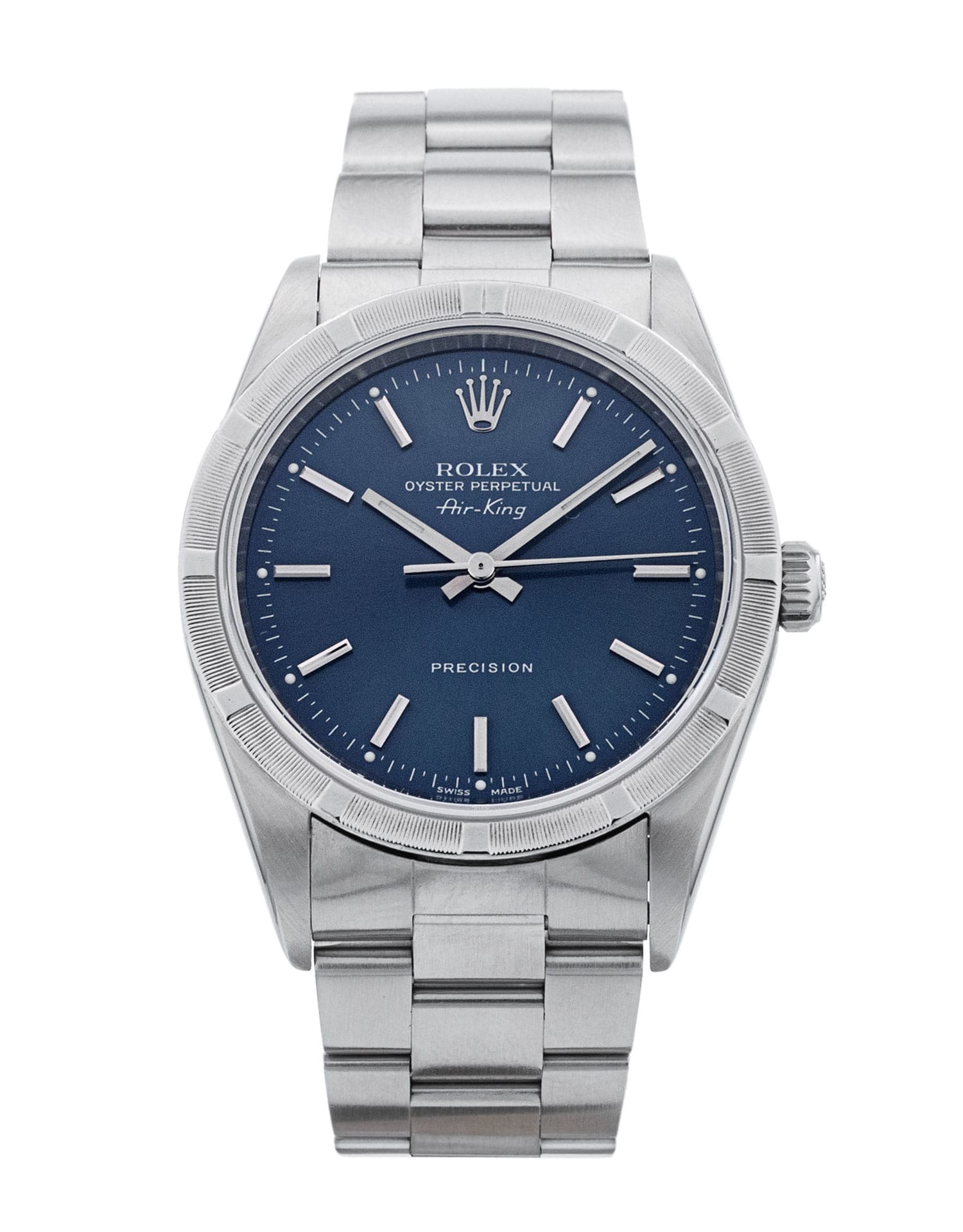 This Rolex Air-King 14010M has a blue quarter arabic dial and a bracelet strap. This Rolex has undergone a thorough inspection of water resistance, accuracy, functionality and condition to determine the level of reconditioning required to meet our strict standards. It has also been referenced against technical documents and manufacturer records where available to ensure authenticity and a clean history. Our watches have a 24-month warranty for your peace of mind, in conjunction with any remaining manufacturer’s warranty from new or from service. To maintain the manufacturer’s warranty on this watch, it has not been polished in our service centre.