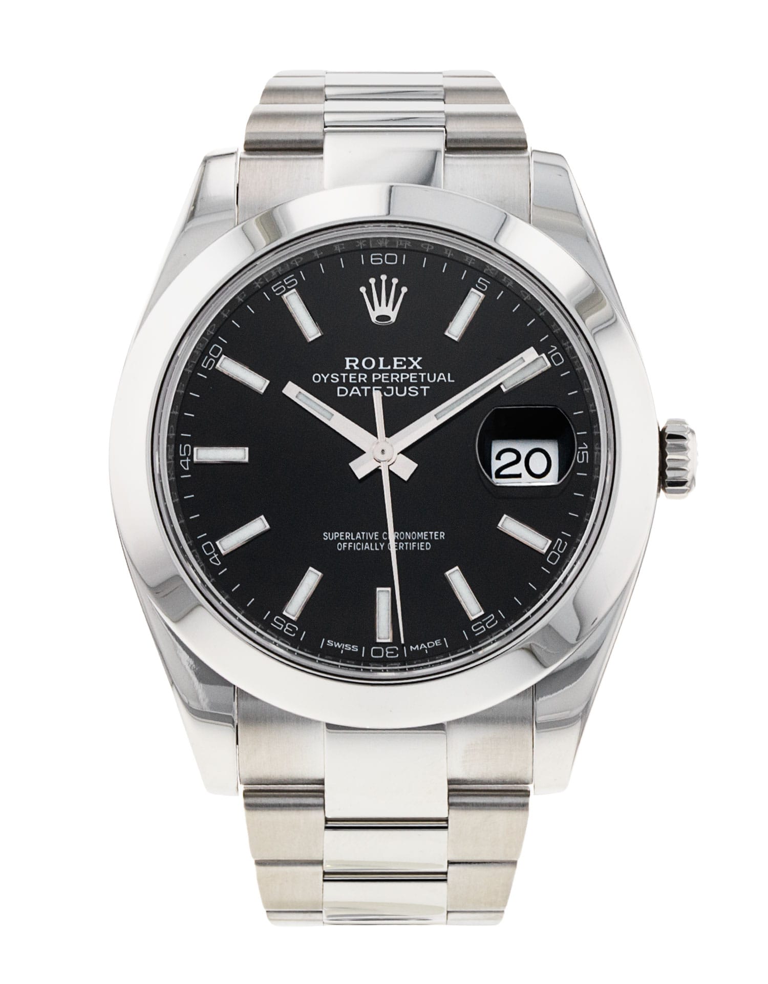 This Rolex Datejust 41 126300 has a black baton dial and a bracelet strap. This Rolex has undergone a thorough inspection of water resistance, accuracy, functionality and condition to determine the level of reconditioning required to meet our strict standards. It has also been referenced against technical documents and manufacturer records where available to ensure authenticity and a clean history. All our watches have a 24-month warranty for your peace of mind. One of our skilled polishing technicians has removed marks on the case and bracelet of this watch, brought about by daily wear and tear, which is why this watch does not come with the remaining manufacturer’s warranty.