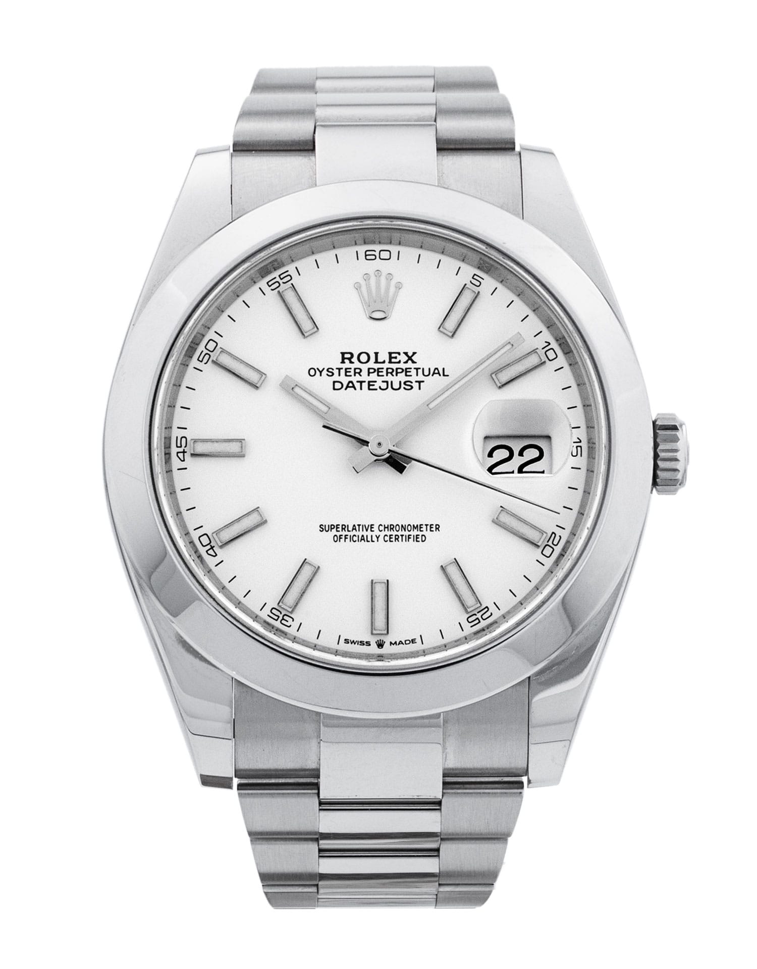 This Rolex Datejust 41 126300 has a white baton dial and a bracelet strap. This Rolex has undergone a thorough inspection of water resistance, accuracy, functionality and condition to determine the level of reconditioning required to meet our strict standards. It has also been referenced against technical documents and manufacturer records where available to ensure authenticity and a clean history. All our watches have a 24-month warranty for your peace of mind. One of our skilled polishing technicians has removed marks on the case and bracelet of this watch, brought about by daily wear and tear, which is why this watch does not come with the remaining manufacturer’s warranty.