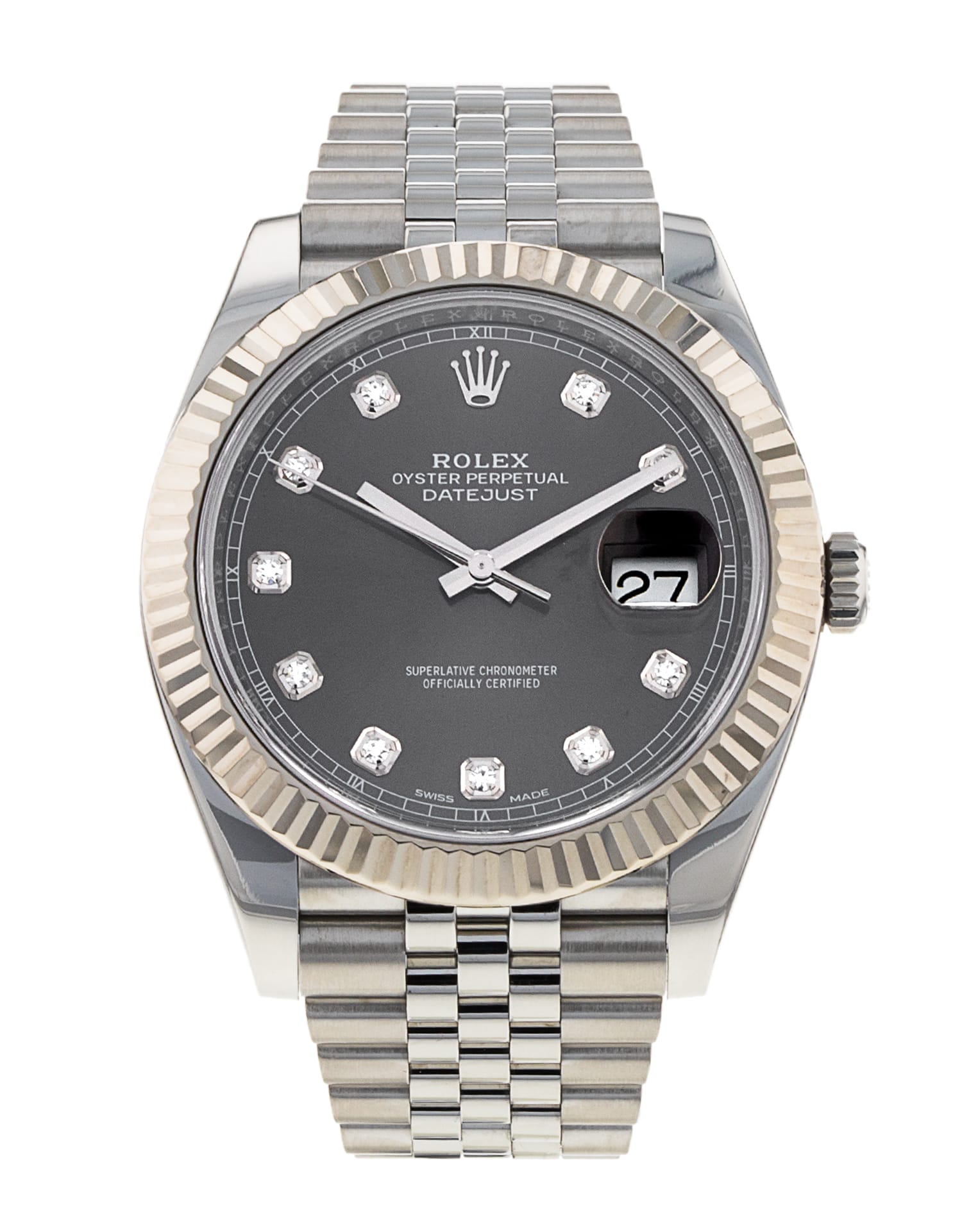 This Rolex Datejust 41 126334 has a slate diamond dial and a bracelet strap. This Rolex has undergone a thorough inspection of water resistance, accuracy, functionality and condition to determine the level of reconditioning required to meet our strict standards. It has also been referenced against technical documents and manufacturer records where available to ensure authenticity and a clean history. All our watches have a 24-month warranty for your peace of mind. One of our skilled polishing technicians has removed marks on the case and bracelet of this watch, brought about by daily wear and tear, which is why this watch does not come with the remaining manufacturer’s warranty.