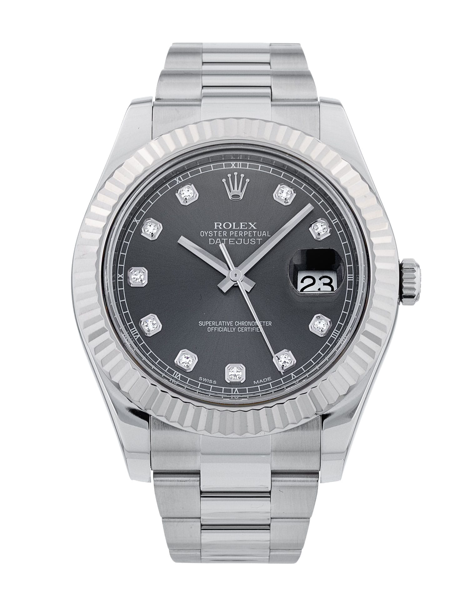 This Rolex Datejust II 116334 has a rhodium diamond dial and a bracelet strap. This Rolex has undergone a thorough inspection of water resistance, accuracy, functionality and condition to determine the level of reconditioning required to meet our strict standards. It has also been referenced against technical documents and manufacturer records where available to ensure authenticity and a clean history. All our watches have a 24-month warranty for your peace of mind. One of our skilled polishing technicians has removed marks on the case and bracelet of this watch, brought about by daily wear and tear, which is why this watch does not come with the remaining manufacturer’s warranty.