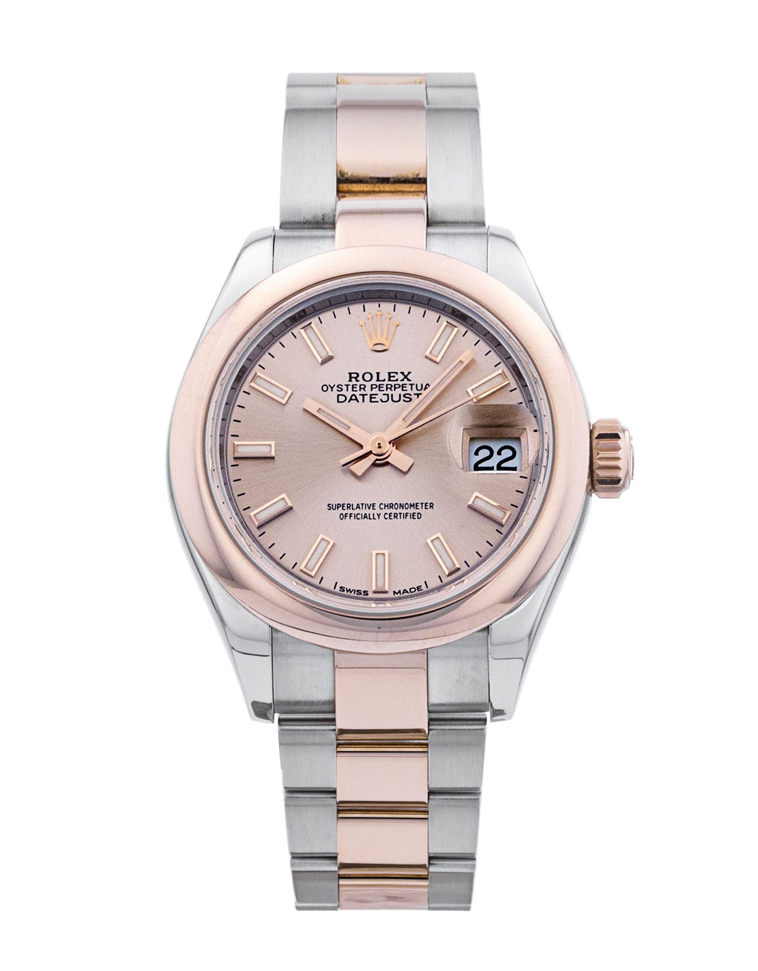 This Rolex Datejust Lady 28 279161 has a rose baton dial and a bracelet strap. This Rolex has undergone a thorough inspection of water resistance, accuracy, functionality and condition to determine the level of reconditioning required to meet our strict standards. It has also been referenced against technical documents and manufacturer records where available to ensure authenticity and a clean history. Our watches have a 24-month warranty for your peace of mind, in conjunction with any remaining manufacturer’s warranty from new or from service. To maintain the manufacturer’s warranty on this watch, it has not been polished in our service centre.
