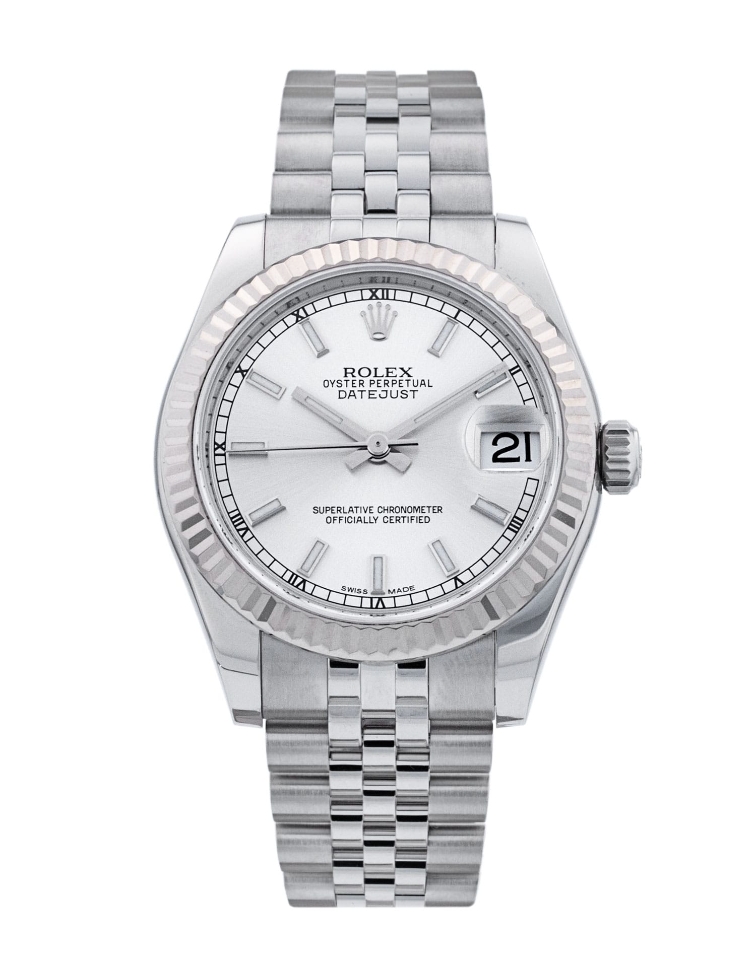 This Rolex Datejust Lady 31 178274 has a silver baton dial and a bracelet strap. This Rolex has undergone a thorough inspection of water resistance, accuracy, functionality and condition to determine the level of reconditioning required to meet our strict standards. It has also been referenced against technical documents and manufacturer records where available to ensure authenticity and a clean history. All our watches have a 24-month warranty for your peace of mind. One of our skilled polishing technicians has removed marks on the case and bracelet of this watch, brought about by daily wear and tear, which is why this watch does not come with the remaining manufacturer’s warranty.
