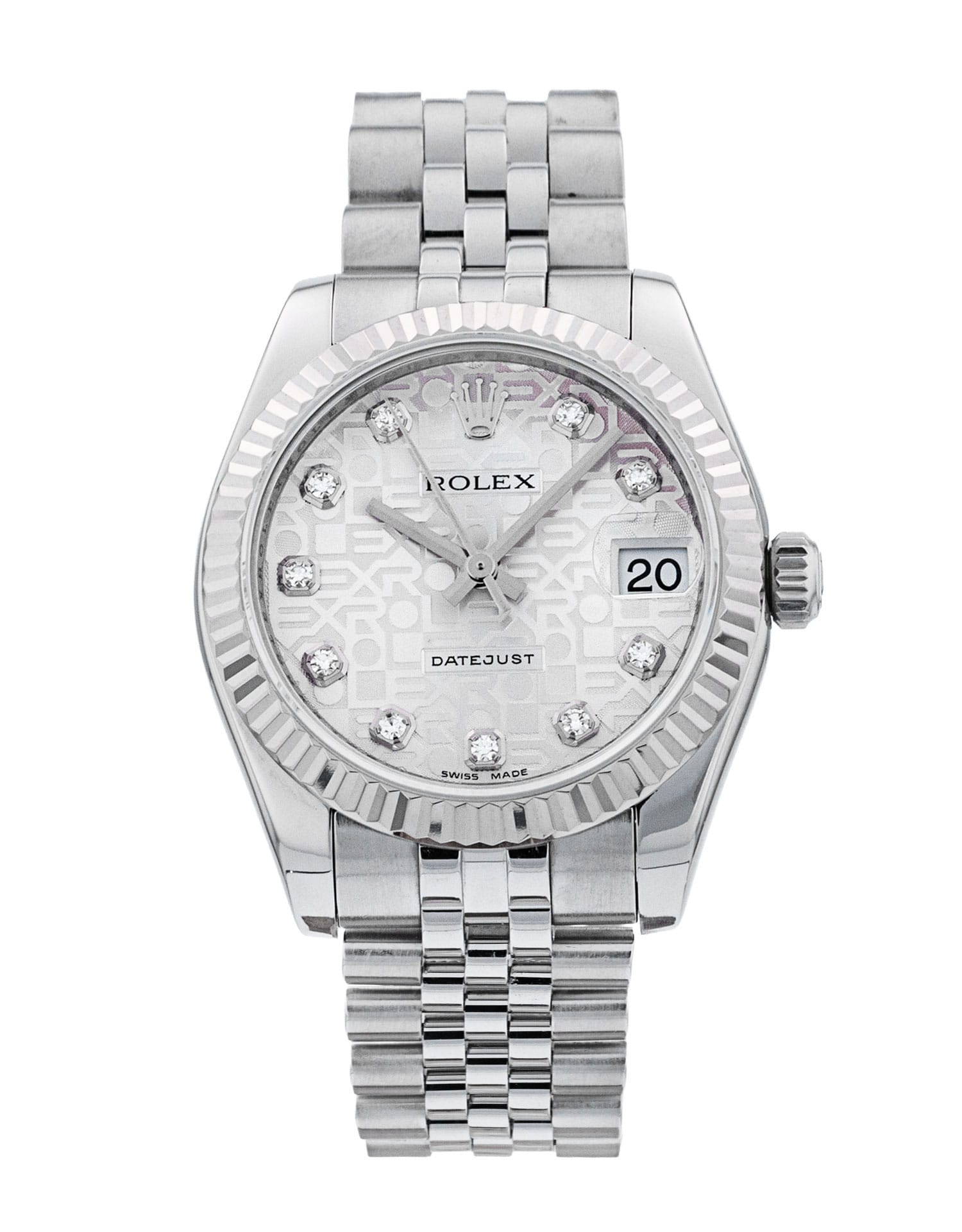 This Rolex Datejust Lady 31 178274 has a silver jubilee diamond dial and a bracelet strap. This Rolex has undergone a thorough inspection of water resistance, accuracy, functionality and condition to determine the level of reconditioning required to meet our strict standards. It has also been referenced against technical documents and manufacturer records where available to ensure authenticity and a clean history. All our watches have a 24-month warranty for your peace of mind. One of our skilled polishing technicians has removed marks on the case and bracelet of this watch, brought about by daily wear and tear, which is why this watch does not come with the remaining manufacturer’s warranty.