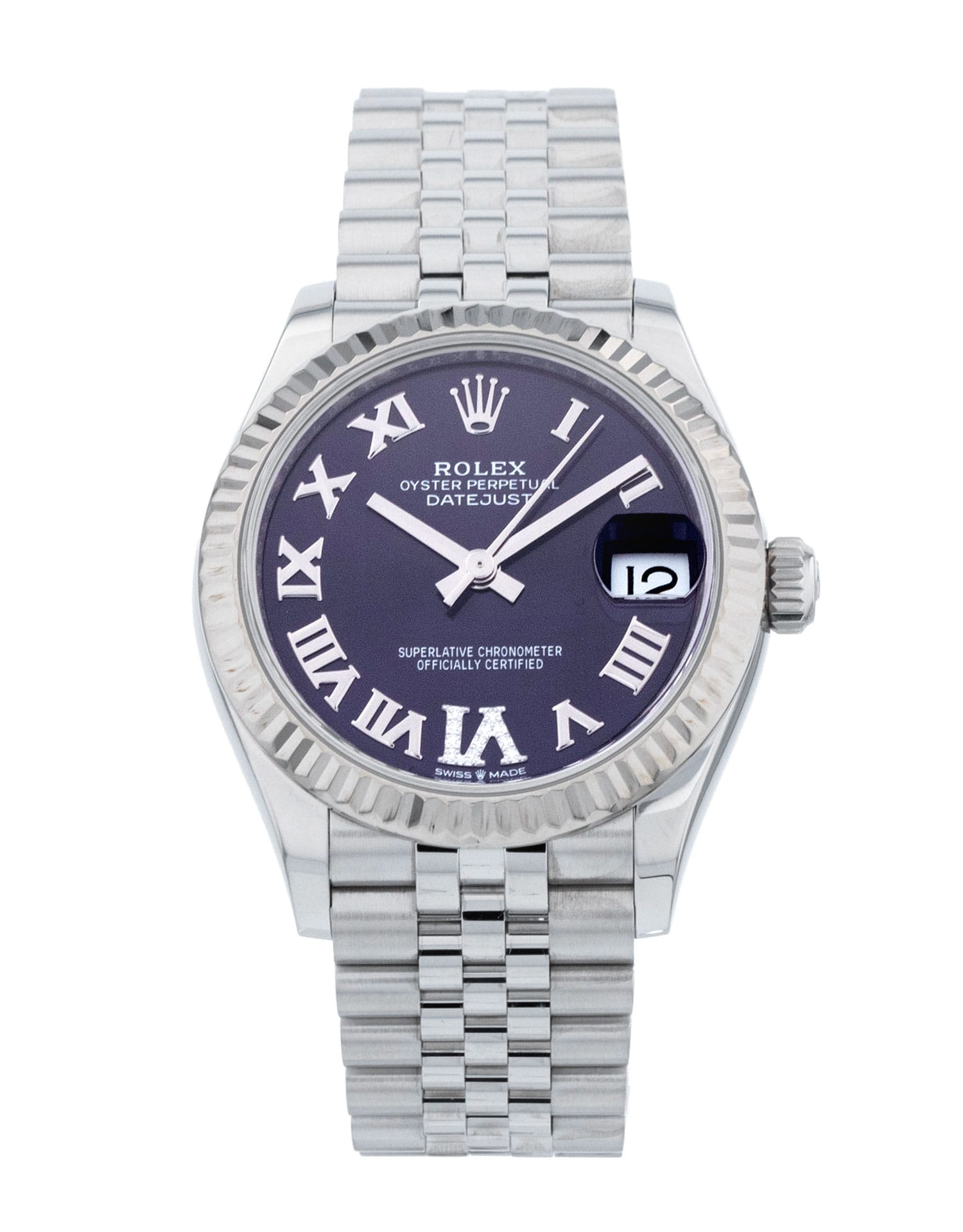 This Rolex Datejust Lady 31 278274 has a aubergine roman numeral diamond dial and a bracelet strap. This Rolex has undergone a thorough inspection of water resistance, accuracy, functionality and condition to determine the level of reconditioning required to meet our strict standards. It has also been referenced against technical documents and manufacturer records where available to ensure authenticity and a clean history. All our watches have a 24-month warranty for your peace of mind. One of our skilled polishing technicians has removed marks on the case and bracelet of this watch, brought about by daily wear and tear, which is why this watch does not come with the remaining manufacturer’s warranty.