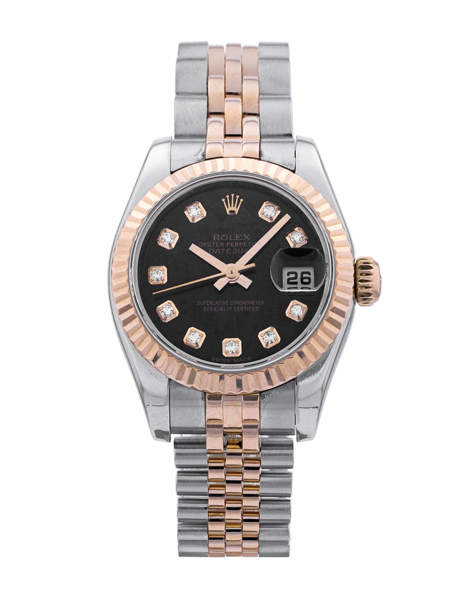 This Rolex Datejust Lady 179171 has a black diamond dial and a bracelet strap. This Rolex has undergone a thorough inspection of water resistance, accuracy, functionality and condition to determine the level of reconditioning required to meet our strict standards. It has also been referenced against technical documents and manufacturer records where available to ensure authenticity and a clean history. All our watches have a 24-month warranty for your peace of mind. One of our skilled polishing technicians has removed marks on the case and bracelet of this watch, brought about by daily wear and tear, which is why this watch does not come with the remaining manufacturer’s warranty.