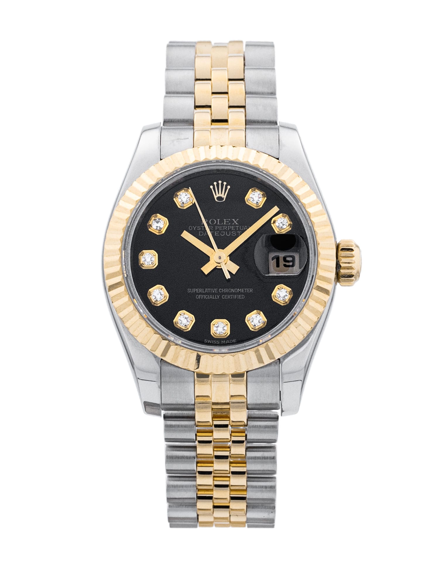 This Rolex Datejust Lady 179173 has a black diamond dial and a bracelet strap. This Rolex has undergone a thorough inspection of water resistance, accuracy, functionality and condition to determine the level of reconditioning required to meet our strict standards. It has also been referenced against technical documents and manufacturer records where available to ensure authenticity and a clean history. All our watches have a 24-month warranty for your peace of mind. One of our skilled polishing technicians has removed marks on the case and bracelet of this watch, brought about by daily wear and tear, which is why this watch does not come with the remaining manufacturer’s warranty.