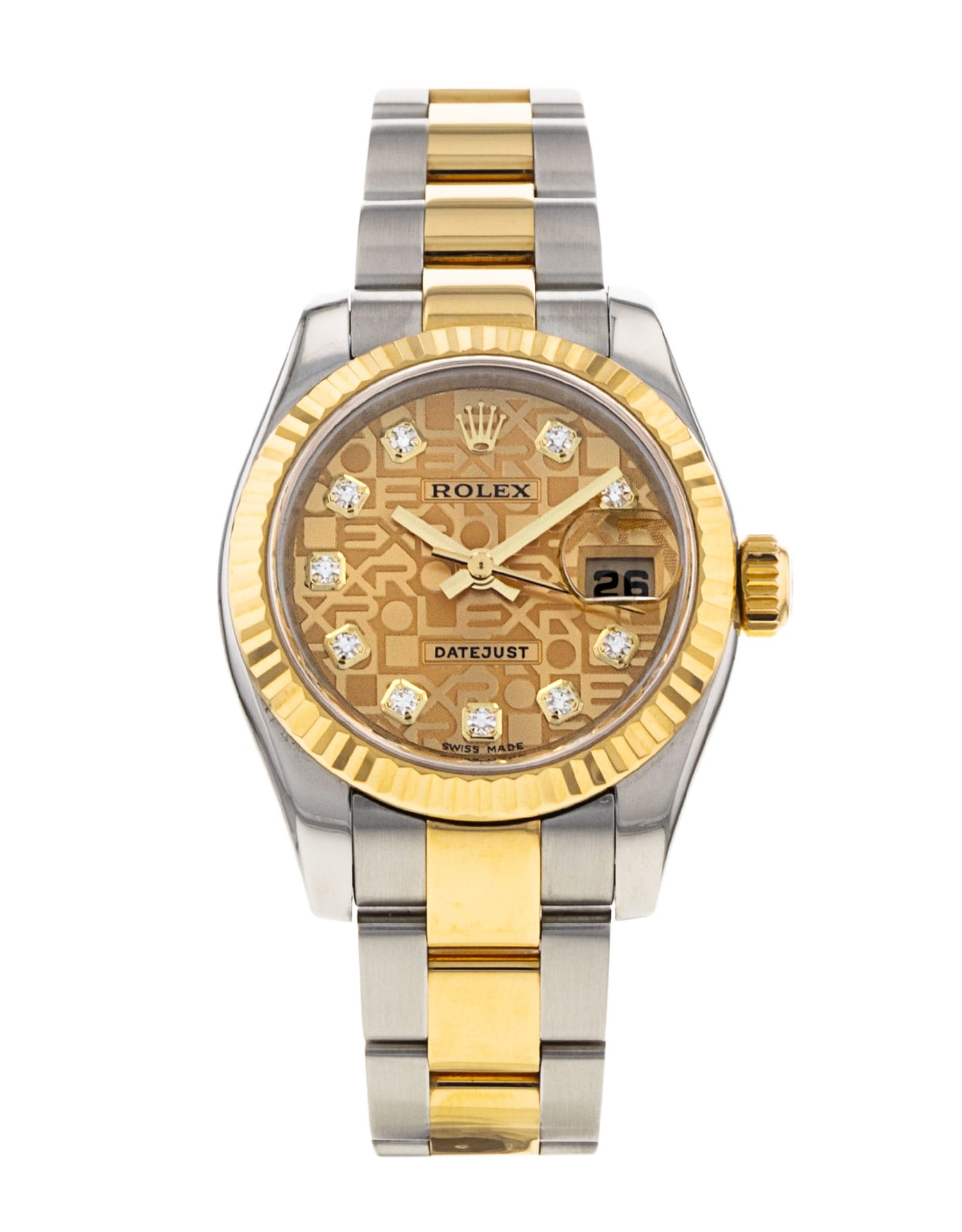This Rolex Datejust Lady 179173 has a champagne jubilee diamond dial and a bracelet strap. This Rolex has undergone a thorough inspection of water resistance, accuracy, functionality and condition to determine the level of reconditioning required to meet our strict standards. It has also been referenced against technical documents and manufacturer records where available to ensure authenticity and a clean history. All our watches have a 24-month warranty for your peace of mind. One of our skilled polishing technicians has removed marks on the case and bracelet of this watch, brought about by daily wear and tear, which is why this watch does not come with the remaining manufacturer’s warranty.