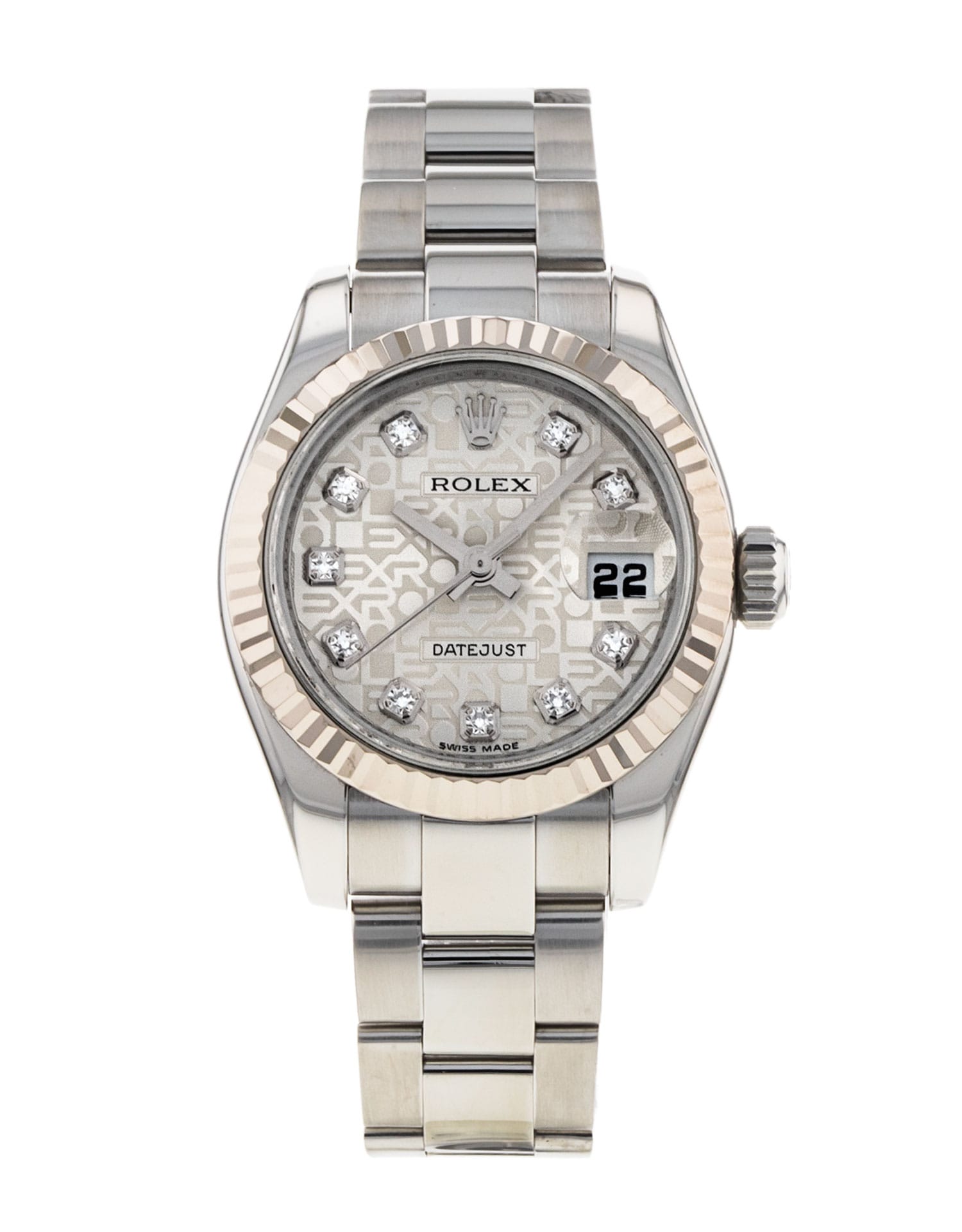 This Rolex Datejust Lady 179174 has a silver jubilee diamond dial and a bracelet strap. This Rolex has undergone a thorough inspection of water resistance, accuracy, functionality and condition to determine the level of reconditioning required to meet our strict standards. It has also been referenced against technical documents and manufacturer records where available to ensure authenticity and a clean history. All our watches have a 24-month warranty for your peace of mind. One of our skilled polishing technicians has removed marks on the case and bracelet of this watch, brought about by daily wear and tear, which is why this watch does not come with the remaining manufacturer’s warranty.