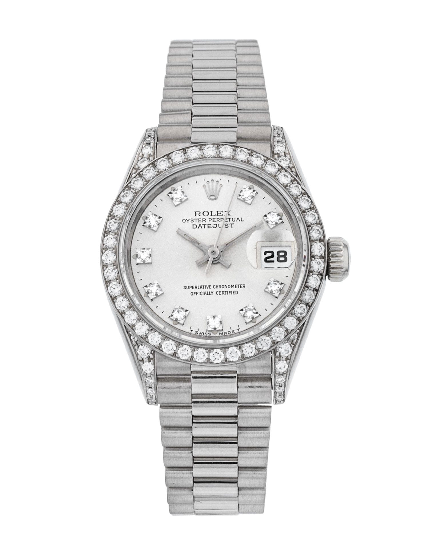 This Rolex Datejust Lady 69159 has a silver diamond dial and a bracelet strap. This Rolex has undergone a thorough inspection of water resistance, accuracy, functionality and condition to determine the level of reconditioning required to meet our strict standards. It has also been referenced against technical documents and manufacturer records where available to ensure authenticity and a clean history. All our watches have a 24-month warranty for your peace of mind. One of our skilled polishing technicians has removed marks on the case and bracelet of this watch, brought about by daily wear and tear, which is why this watch does not come with the remaining manufacturer’s warranty.