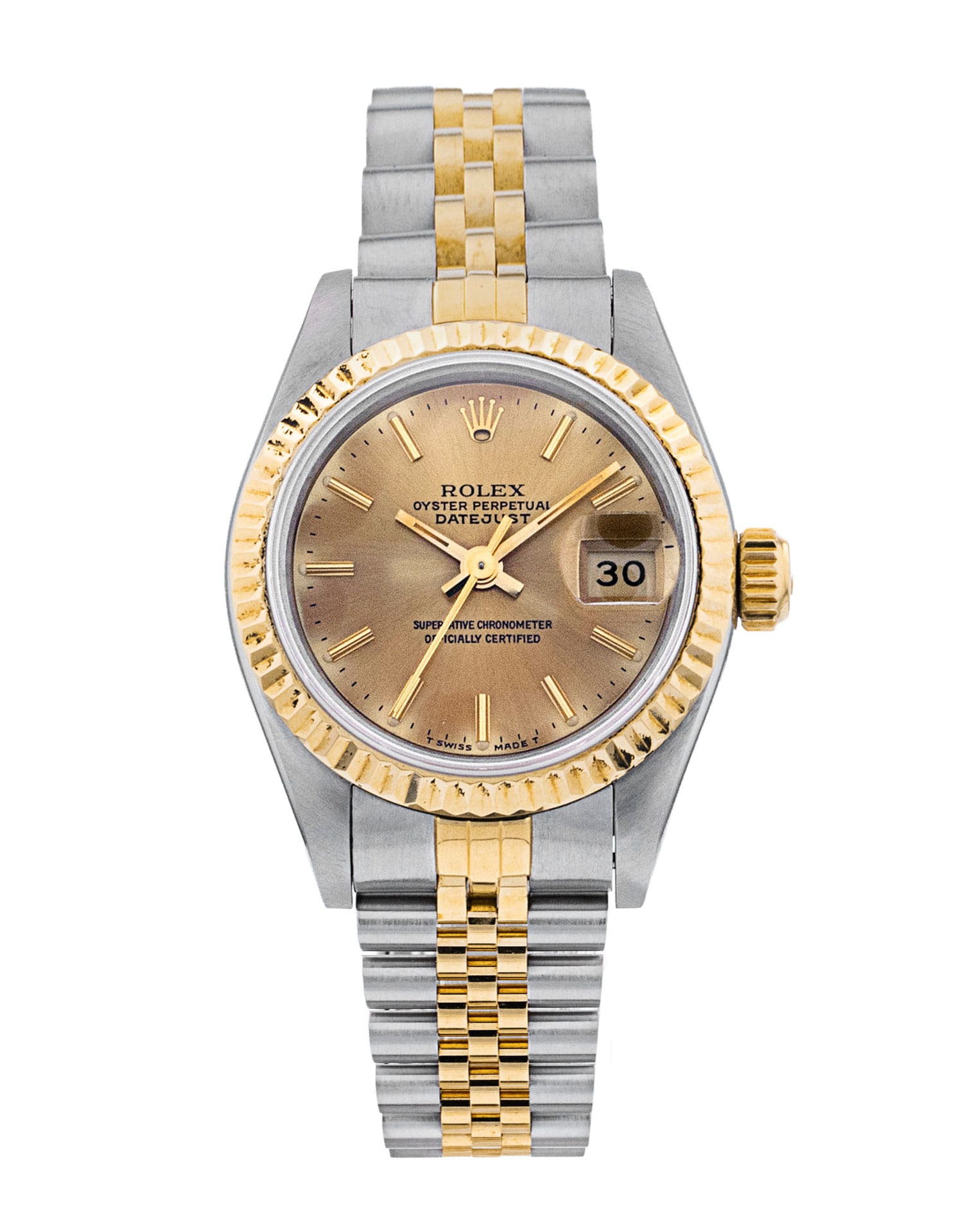 This Rolex Datejust Lady 69173 has a champagne baton dial and a bracelet strap. This Rolex has undergone a thorough inspection of water resistance, accuracy, functionality and condition to determine the level of reconditioning required to meet our strict standards. It has also been referenced against technical documents and manufacturer records where available to ensure authenticity and a clean history. All our watches have a 24-month warranty for your peace of mind. One of our skilled polishing technicians has removed marks on the case and bracelet of this watch, brought about by daily wear and tear, which is why this watch does not come with the remaining manufacturer’s warranty.