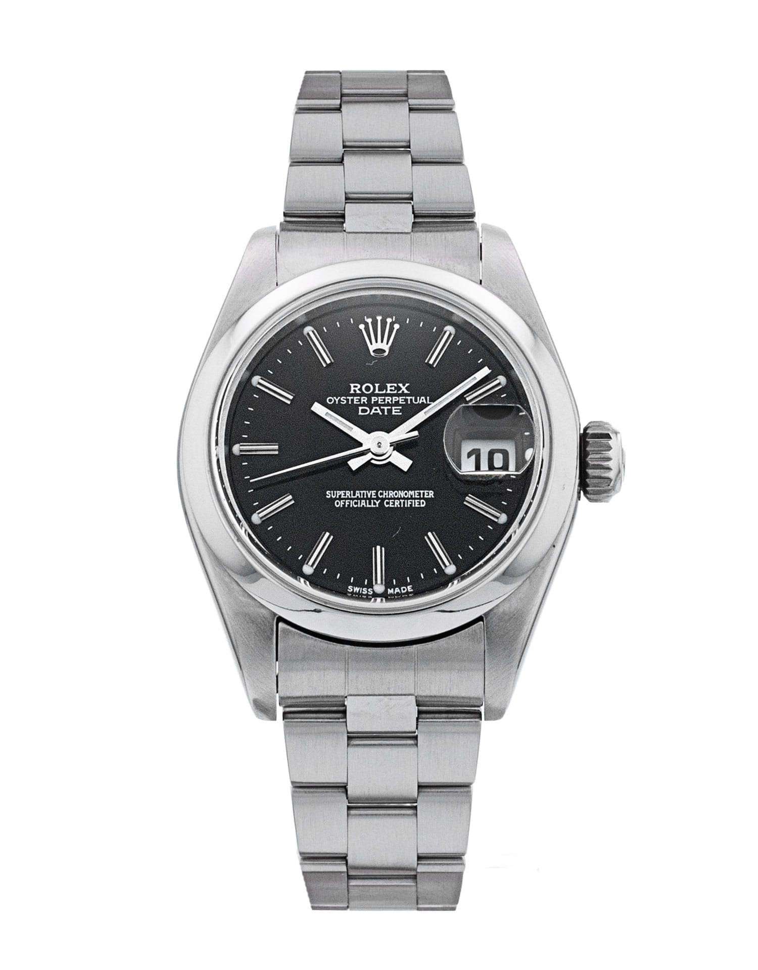 This Rolex Datejust Lady 79160 has a black baton dial and a bracelet strap. This Rolex has undergone a thorough inspection of water resistance, accuracy, functionality and condition to determine the level of reconditioning required to meet our strict standards. It has also been referenced against technical documents and manufacturer records where available to ensure authenticity and a clean history. Our watches have a 24-month warranty for your peace of mind, in conjunction with any remaining manufacturer’s warranty from new or from service. To maintain the manufacturer’s warranty on this watch, it has not been polished in our service centre.