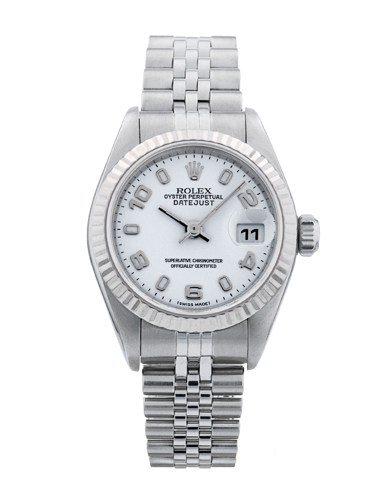 This Rolex Datejust Lady 79174 has a white arabic dial and a bracelet strap. This Rolex has undergone a thorough inspection of water resistance, accuracy, functionality and condition to determine the level of reconditioning required to meet our strict standards. It has also been referenced against technical documents and manufacturer records where available to ensure authenticity and a clean history. All our watches have a 24-month warranty for your peace of mind. One of our skilled polishing technicians has removed marks on the case and bracelet of this watch, brought about by daily wear and tear, which is why this watch does not come with the remaining manufacturer’s warranty.