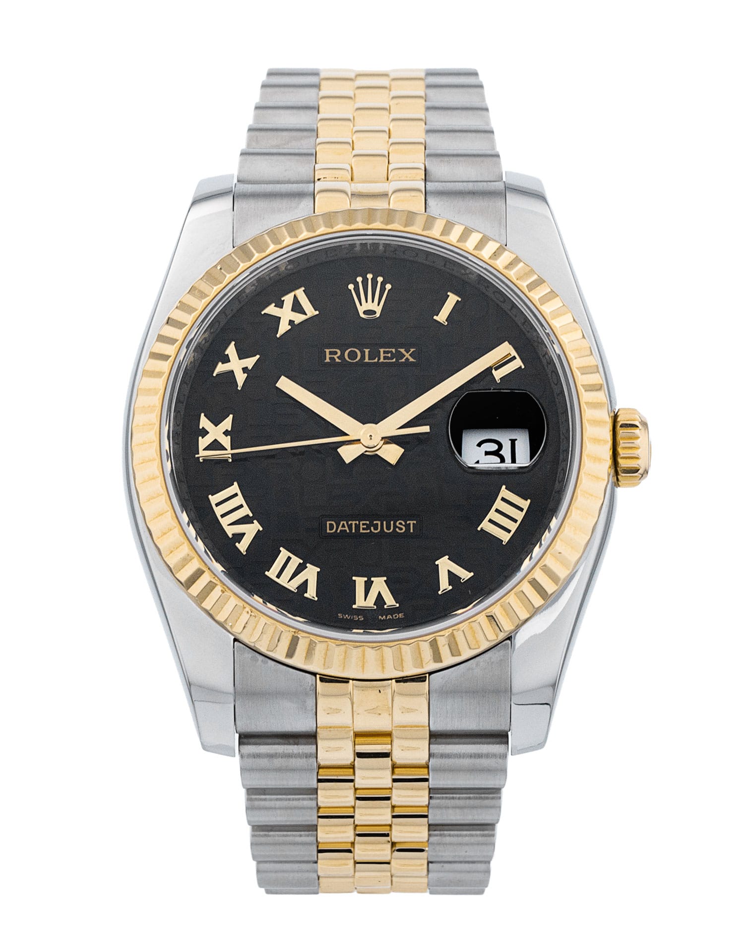 This Rolex Datejust 116233 has a black jubilee roman numeral dial and a bracelet strap. This Rolex has undergone a thorough inspection of water resistance, accuracy, functionality and condition to determine the level of reconditioning required to meet our strict standards. It has also been referenced against technical documents and manufacturer records where available to ensure authenticity and a clean history. Our watches have a 24-month warranty for your peace of mind, in conjunction with any remaining manufacturer’s warranty from new or from service. To maintain the manufacturer’s warranty on this watch, it has not been polished in our service centre.
