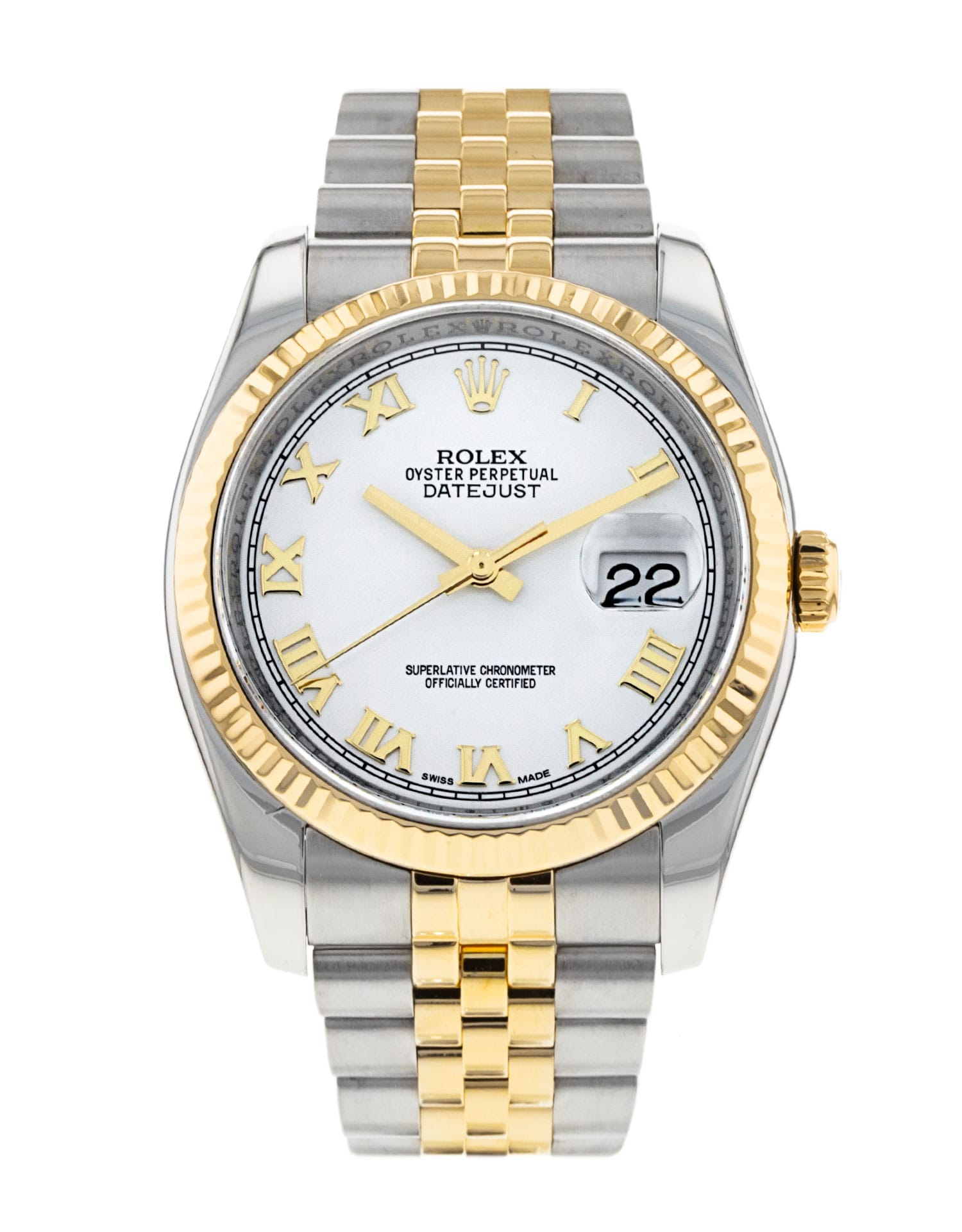 This Rolex Datejust 116233 has a white roman numeral dial and a bracelet strap. This Rolex has undergone a thorough inspection of water resistance, accuracy, functionality and condition to determine the level of reconditioning required to meet our strict standards. It has also been referenced against technical documents and manufacturer records where available to ensure authenticity and a clean history. All our watches have a 24-month warranty for your peace of mind. One of our skilled polishing technicians has removed marks on the case and bracelet of this watch, brought about by daily wear and tear, which is why this watch does not come with the remaining manufacturer’s warranty.