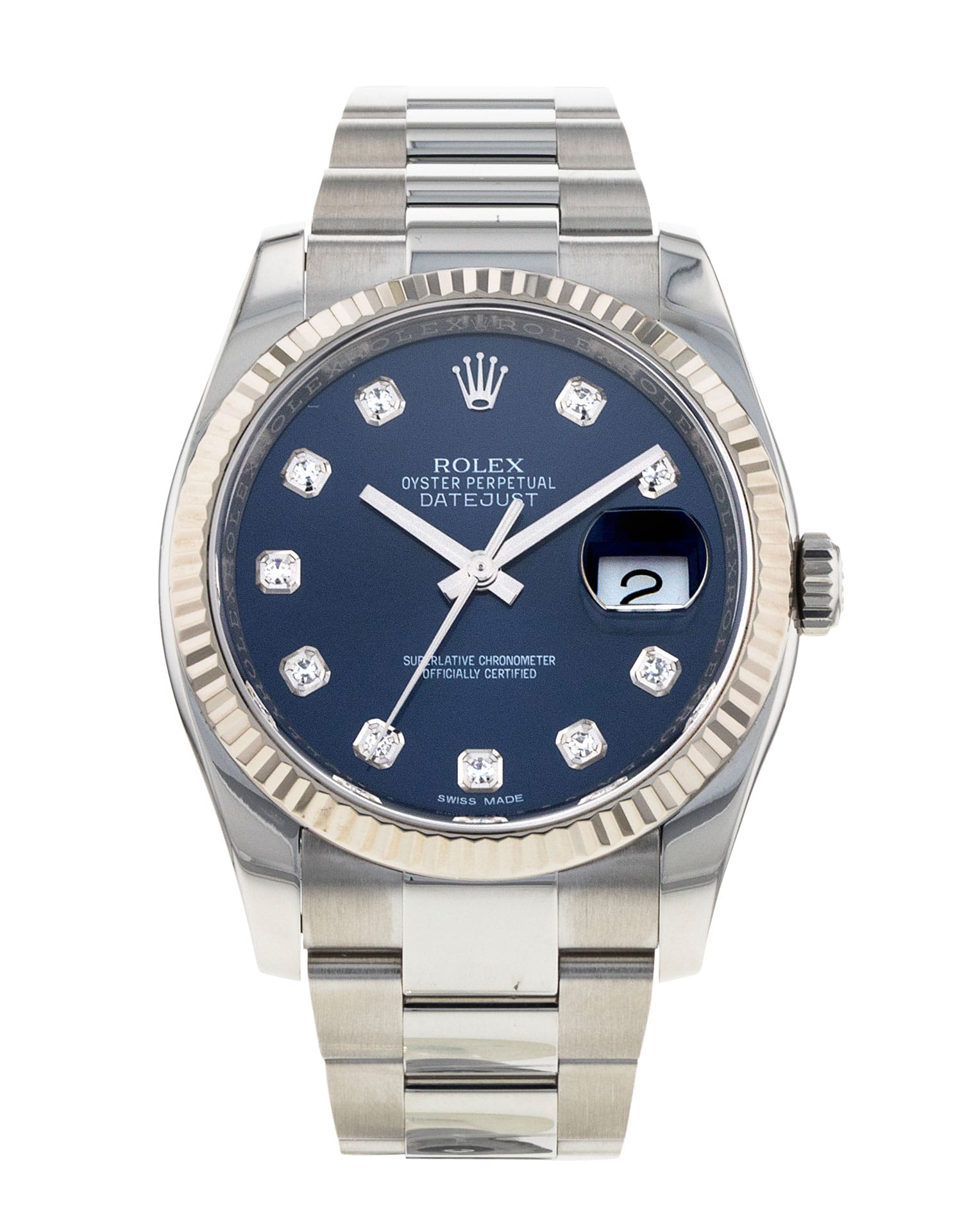 This Rolex Datejust 116234 has a blue diamond dial and a bracelet strap. This Rolex has undergone a thorough inspection of water resistance, accuracy, functionality and condition to determine the level of reconditioning required to meet our strict standards. It has also been referenced against technical documents and manufacturer records where available to ensure authenticity and a clean history. All our watches have a 24-month warranty for your peace of mind. One of our skilled polishing technicians has removed marks on the case and bracelet of this watch, brought about by daily wear and tear, which is why this watch does not come with the remaining manufacturer’s warranty.