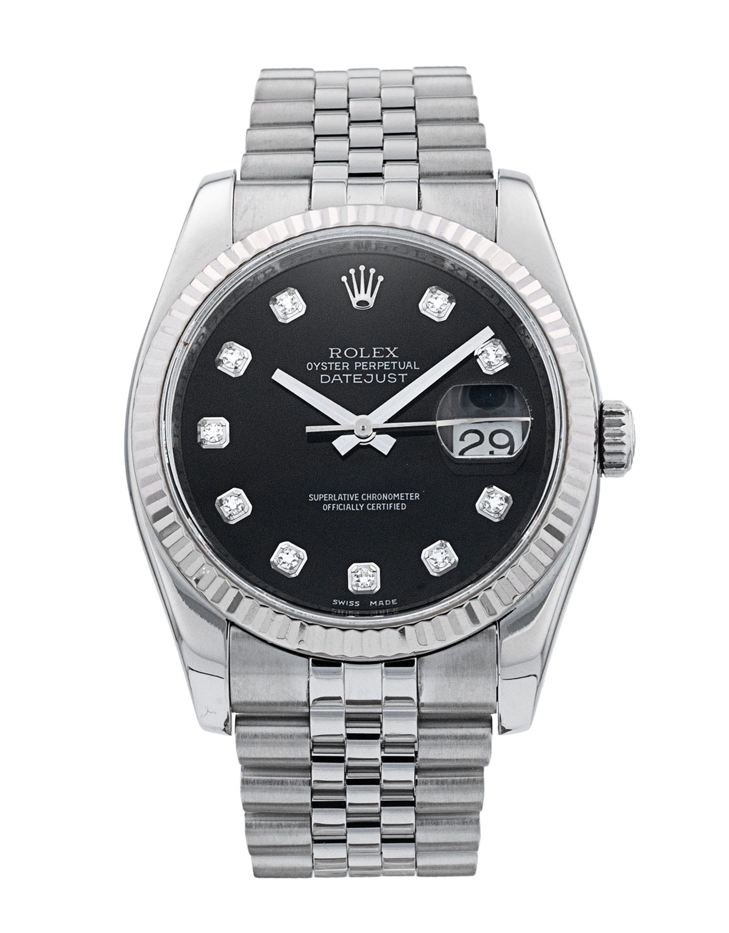 This Rolex Datejust 116234 has a black diamond dial and a bracelet strap. This Rolex has undergone a thorough inspection of water resistance, accuracy, functionality and condition to determine the level of reconditioning required to meet our strict standards. It has also been referenced against technical documents and manufacturer records where available to ensure authenticity and a clean history. All our watches have a 24-month warranty for your peace of mind. One of our skilled polishing technicians has removed marks on the case and bracelet of this watch, brought about by daily wear and tear, which is why this watch does not come with the remaining manufacturer’s warranty.