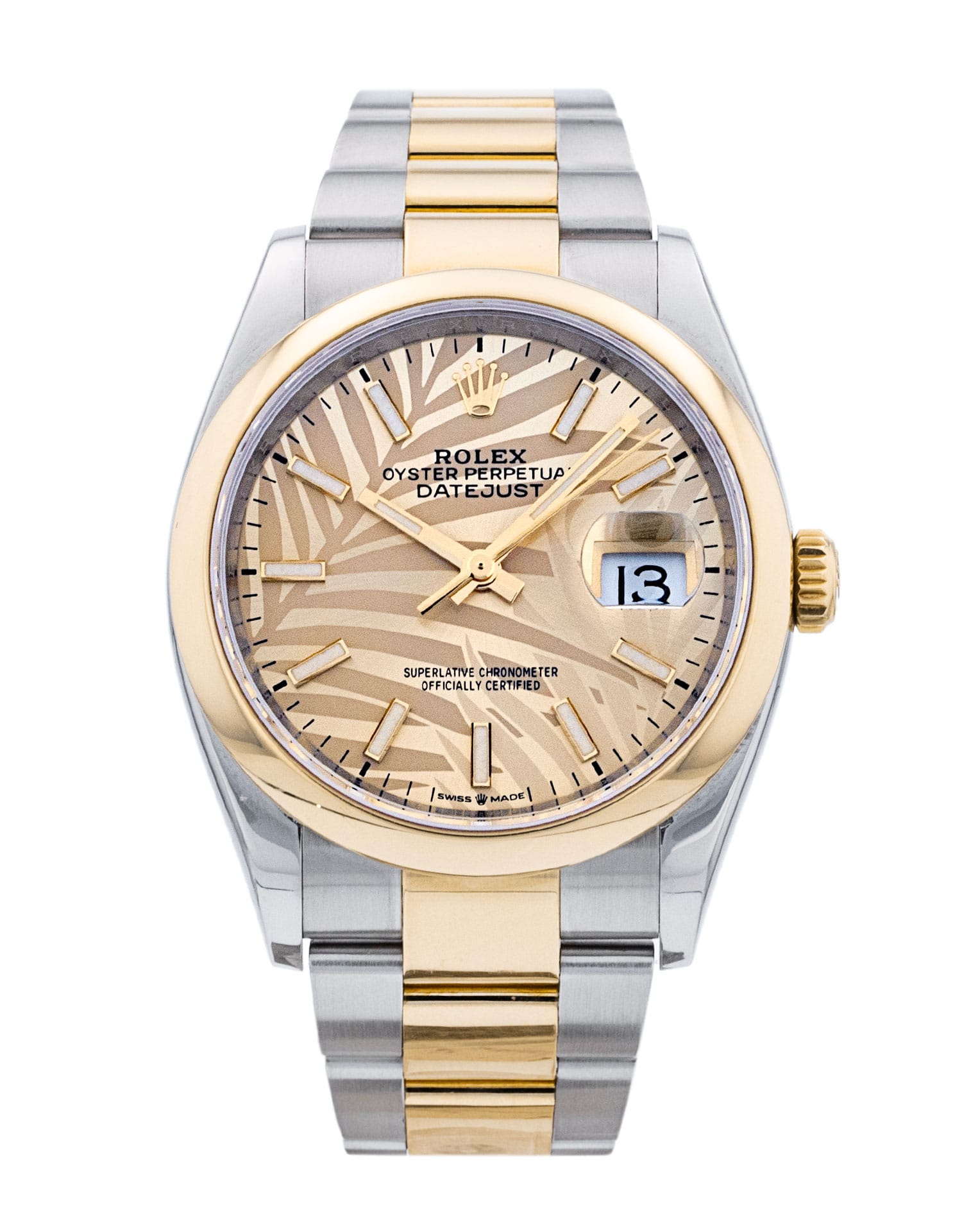 This Rolex Datejust 126203 has a golden palm motif dial and a bracelet strap. This Rolex has undergone a thorough inspection of water resistance, accuracy, functionality and condition to determine the level of reconditioning required to meet our strict standards. It has also been referenced against technical documents and manufacturer records where available to ensure authenticity and a clean history. All our watches have a 24-month warranty for your peace of mind. One of our skilled polishing technicians has removed marks on the case and bracelet of this watch, brought about by daily wear and tear, which is why this watch does not come with the remaining manufacturer’s warranty.