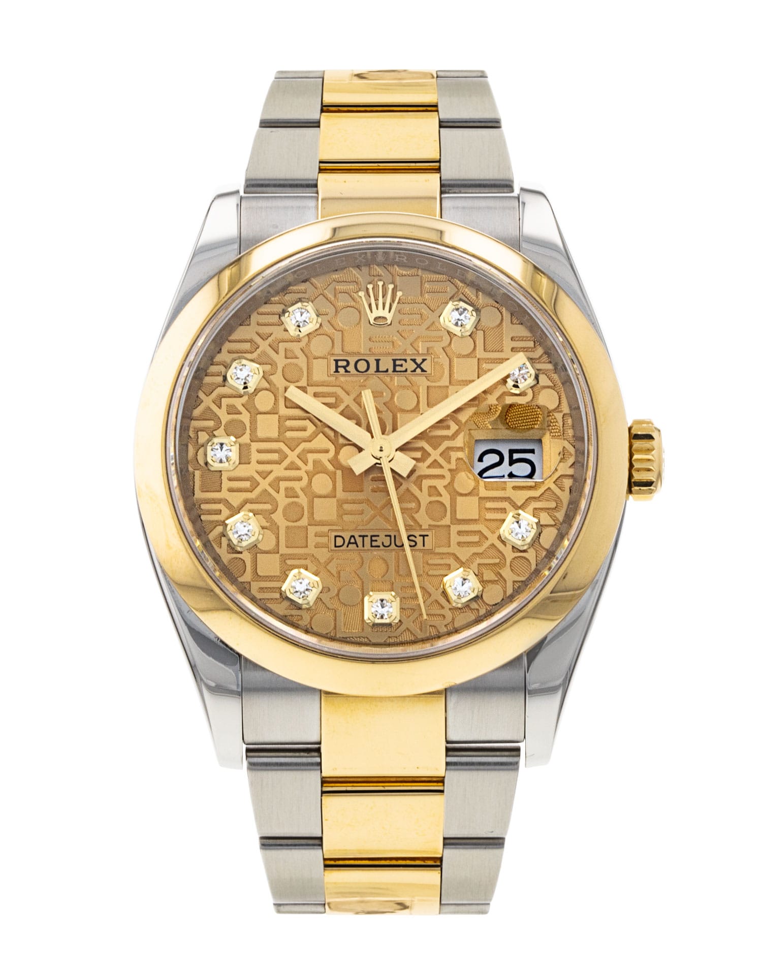 This Rolex Datejust 126203 has a champagne jubilee diamond dial and a bracelet strap. This Rolex has undergone a thorough inspection of water resistance, accuracy, functionality and condition to determine the level of reconditioning required to meet our strict standards. It has also been referenced against technical documents and manufacturer records where available to ensure authenticity and a clean history. All our watches have a 24-month warranty for your peace of mind. One of our skilled polishing technicians has removed marks on the case and bracelet of this watch, brought about by daily wear and tear, which is why this watch does not come with the remaining manufacturer’s warranty.