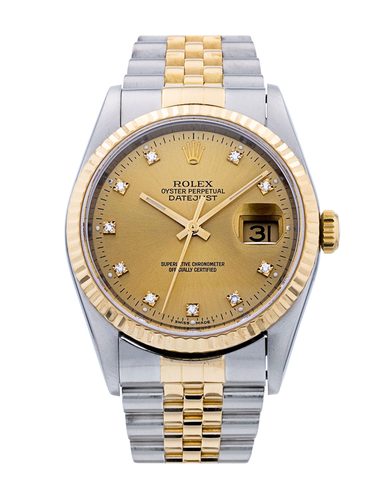 This Rolex Datejust 16233 has a champagne diamond dial and a bracelet strap. This Rolex has undergone a thorough inspection of water resistance, accuracy, functionality and condition to determine the level of reconditioning required to meet our strict standards. It has also been referenced against technical documents and manufacturer records where available to ensure authenticity and a clean history. All our watches have a 24-month warranty for your peace of mind. One of our skilled polishing technicians has removed marks on the case and bracelet of this watch, brought about by daily wear and tear, which is why this watch does not come with the remaining manufacturer’s warranty.