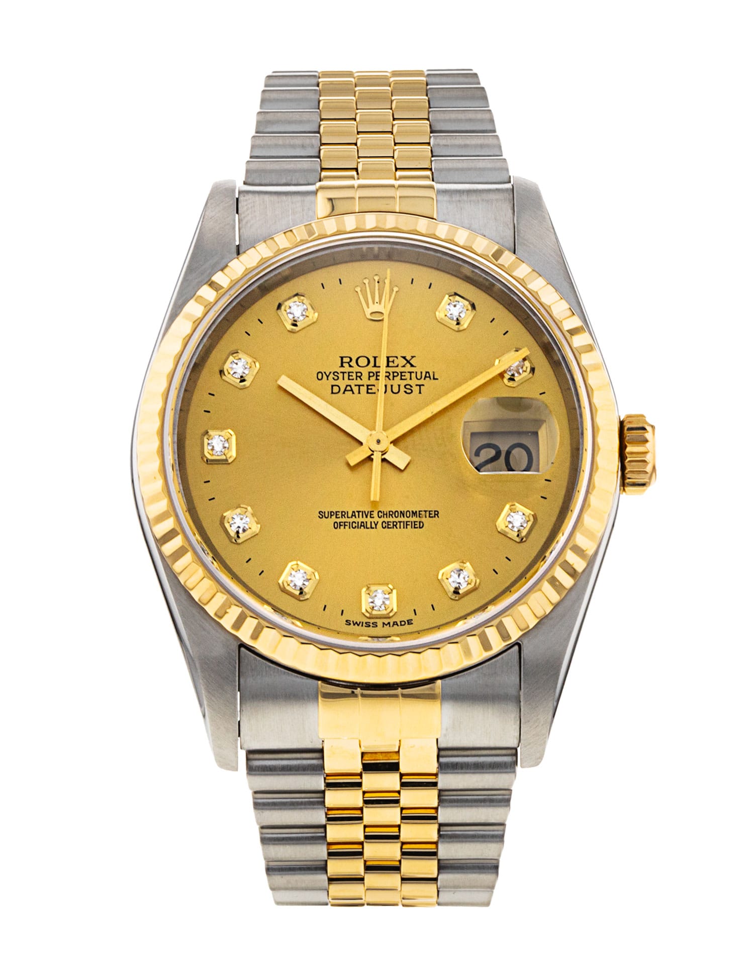 This Rolex Datejust 16233 has a champagne diamond dial and a bracelet strap. This Rolex has undergone a thorough inspection of water resistance, accuracy, functionality and condition to determine the level of reconditioning required to meet our strict standards. It has also been referenced against technical documents and manufacturer records where available to ensure authenticity and a clean history. All our watches have a 24-month warranty for your peace of mind. One of our skilled polishing technicians has removed marks on the case and bracelet of this watch, brought about by daily wear and tear, which is why this watch does not come with the remaining manufacturer’s warranty.