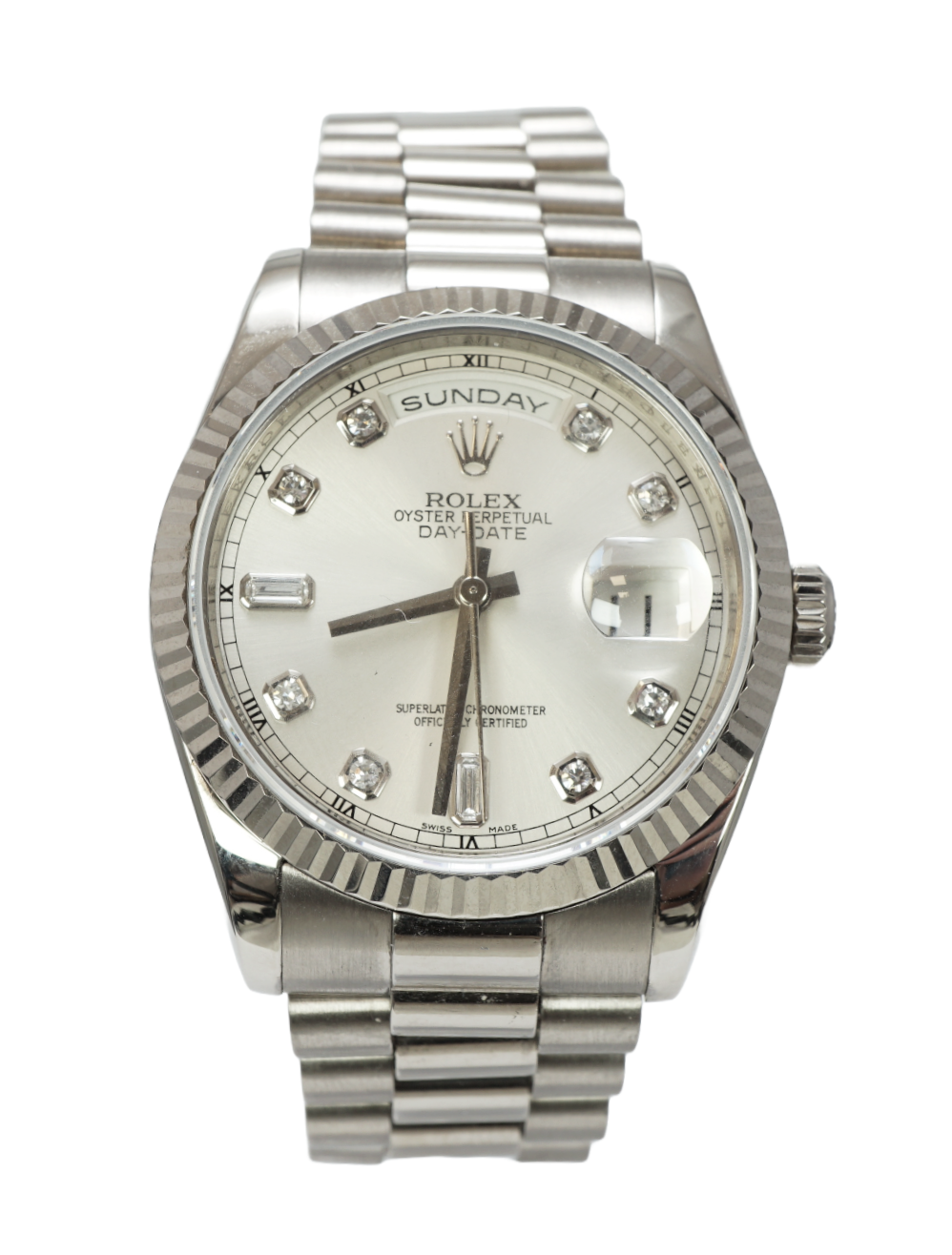 This Rolex Day-Date 118239 has a silver diamond dial and a bracelet strap. This Rolex has undergone a thorough inspection of water resistance, accuracy, functionality and condition to determine the level of reconditioning required to meet our strict standards. It has also been referenced against technical documents and manufacturer records where available to ensure authenticity and a clean history. All our watches have a 24-month warranty for your peace of mind. One of our skilled polishing technicians has removed marks on the case and bracelet of this watch, brought about by daily wear and tear, which is why this watch does not come with the remaining manufacturer’s warranty.