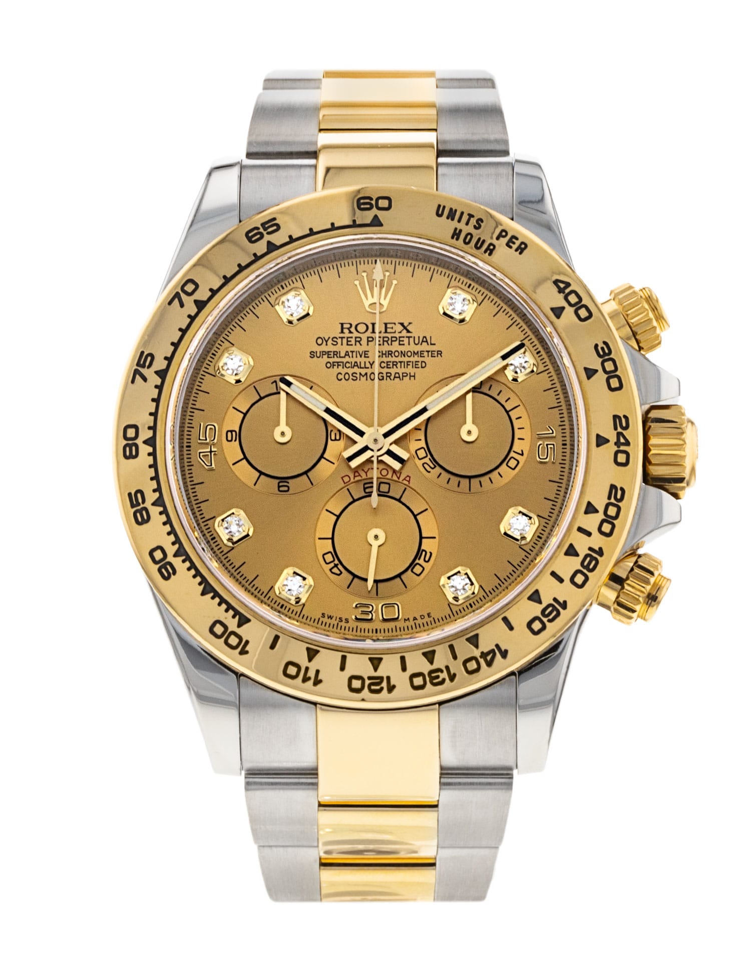 This Rolex Daytona 116503 has a champagne diamond dial and a bracelet strap. This Rolex has undergone a thorough inspection of water resistance, accuracy, functionality and condition to determine the level of reconditioning required to meet our strict standards. It has also been referenced against technical documents and manufacturer records where available to ensure authenticity and a clean history. All our watches have a 24-month warranty for your peace of mind. One of our skilled polishing technicians has removed marks on the case and bracelet of this watch, brought about by daily wear and tear, which is why this watch does not come with the remaining manufacturer’s warranty.
