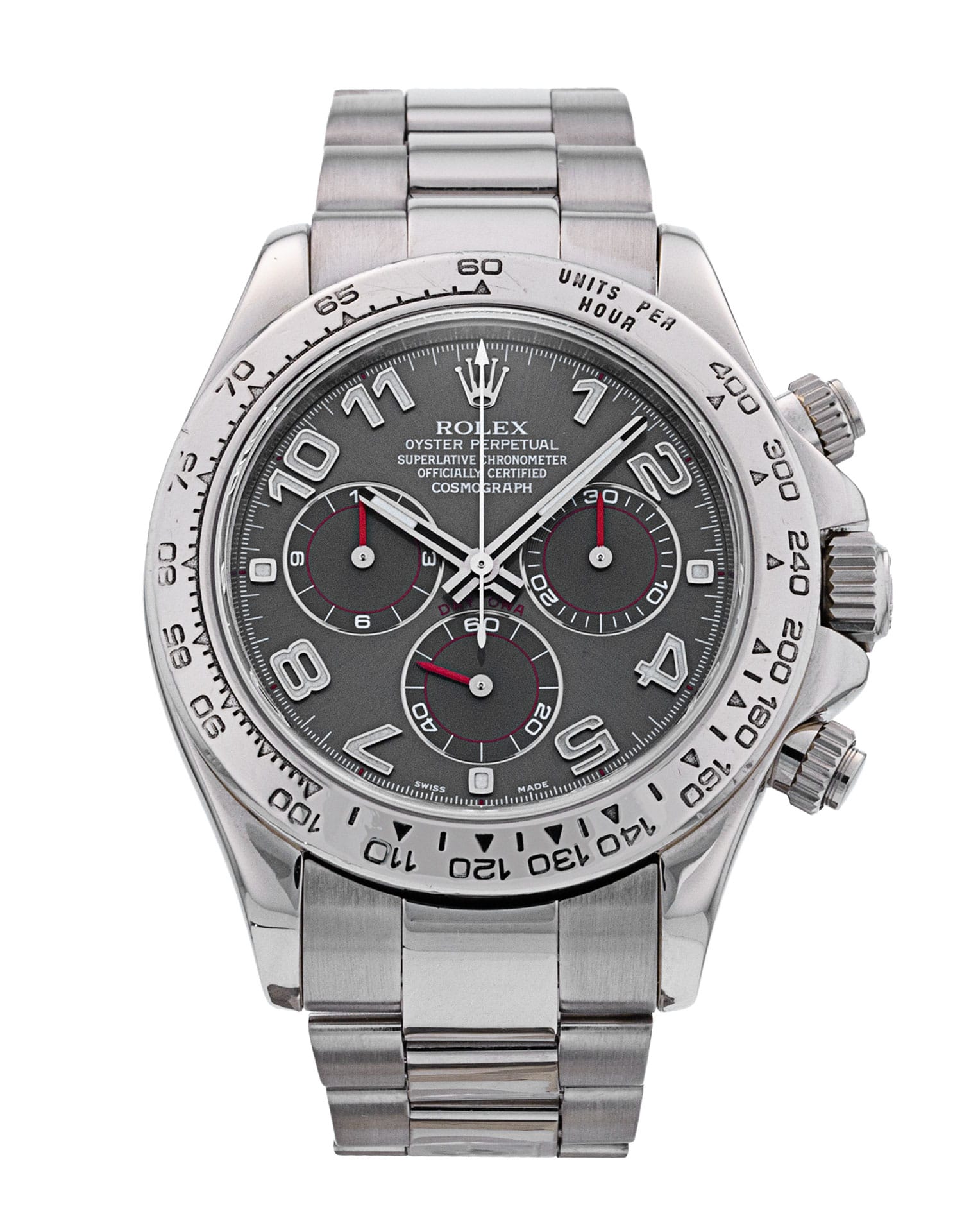 This Rolex Daytona 116509 has a grey arabic dial and a bracelet strap. This Rolex has undergone a thorough inspection of water resistance, accuracy, functionality and condition to determine the level of reconditioning required to meet our strict standards. It has also been referenced against technical documents and manufacturer records where available to ensure authenticity and a clean history. Our watches have a 24-month warranty for your peace of mind, in conjunction with any remaining manufacturer’s warranty from new or from service. To maintain the manufacturer’s warranty on this watch, it has not been polished in our service centre.