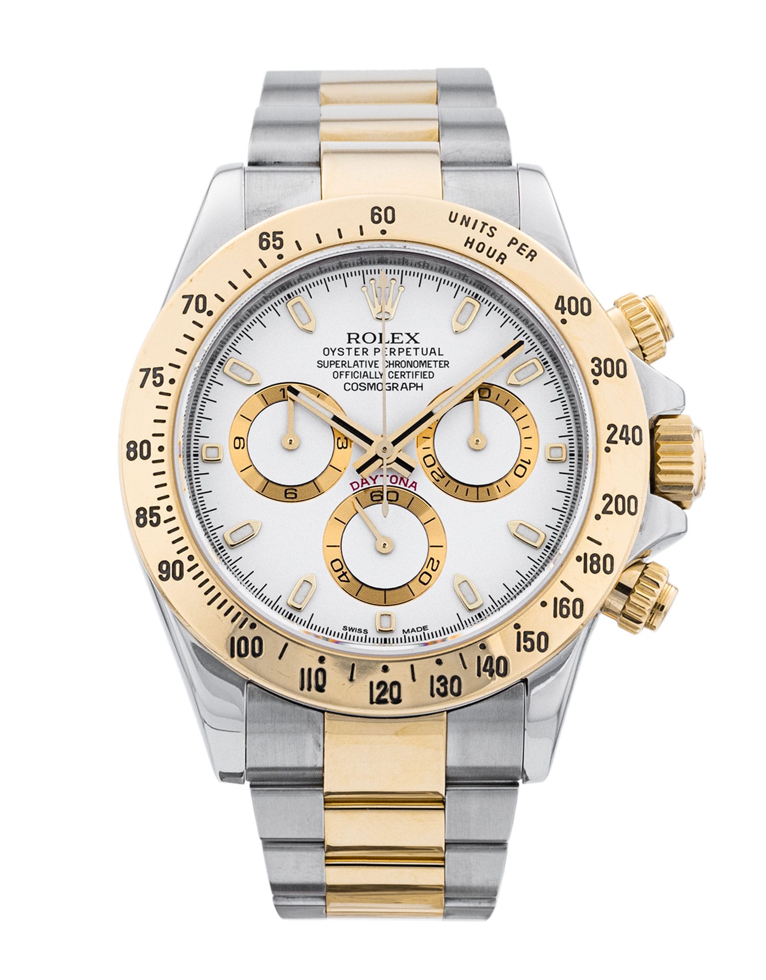 This Rolex Daytona 116523 has a white baton dial and a bracelet strap. This Rolex has undergone a thorough inspection of water resistance, accuracy, functionality and condition to determine the level of reconditioning required to meet our strict standards. It has also been referenced against technical documents and manufacturer records where available to ensure authenticity and a clean history. All our watches have a 24-month warranty for your peace of mind. One of our skilled polishing technicians has removed marks on the case and bracelet of this watch, brought about by daily wear and tear, which is why this watch does not come with the remaining manufacturer’s warranty.