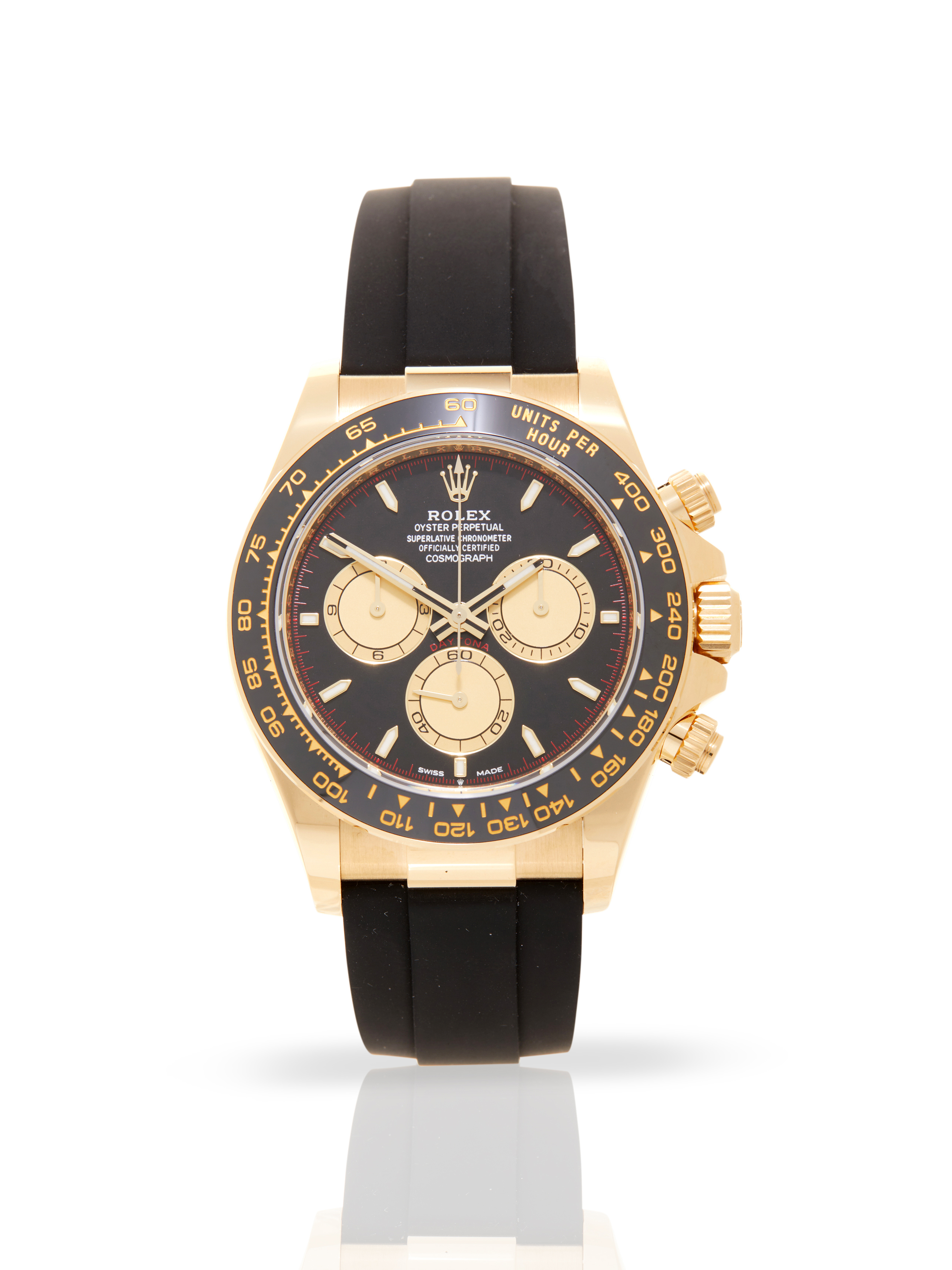 This Rolex Daytona 126518 LN has a black dial and a rubber strap. This Rolex has undergone a thorough inspection of water resistance, accuracy, functionality and condition to determine the level of reconditioning required to meet our strict standards. It has also been referenced against technical documents and manufacturer records where available to ensure authenticity and a clean history. Our watches have a 24-month warranty for your peace of mind, in conjunction with any remaining manufacturer’s warranty from new or from service. To maintain the manufacturer’s warranty on this watch, it has not been polished in our service centre.
