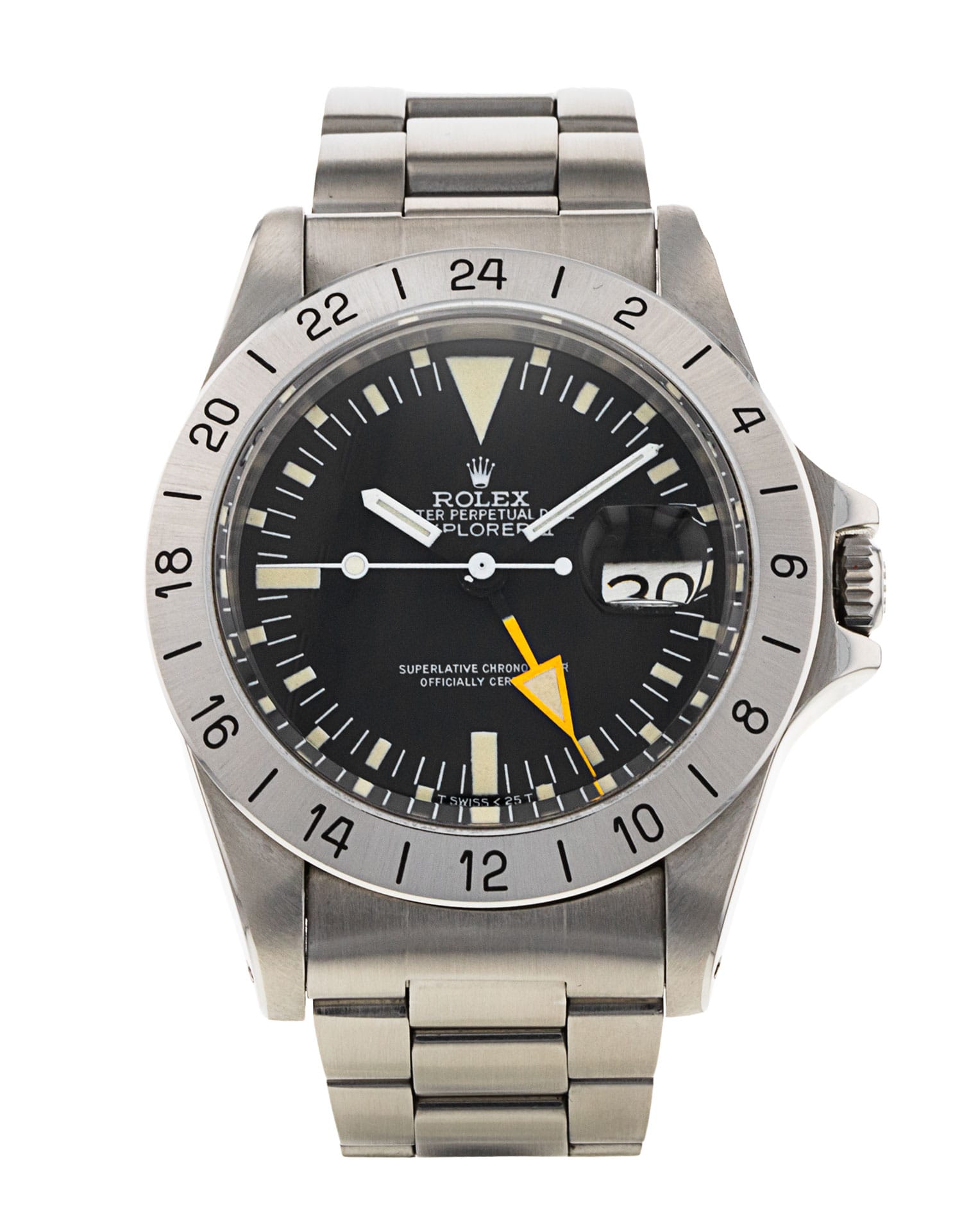 This Rolex Explorer II 1655 has a black baton dial and a bracelet strap. Due to age, this Rolex may not fall within our typical expected tolerances for timekeeping, and is no longer suitable for use in wet environments or submersion in water. In the interests of preserving original features, utmost care has been taken to sympathetically restore this watch. It has also been referenced against technical documents and manufacturer records where available to ensure authenticity and a clean history. One of our skilled polishing technicians has removed marks on the case and bracelet of this watch, brought about by daily wear and tear, which is why this watch does not come with the remaining manufacturer’s warranty.