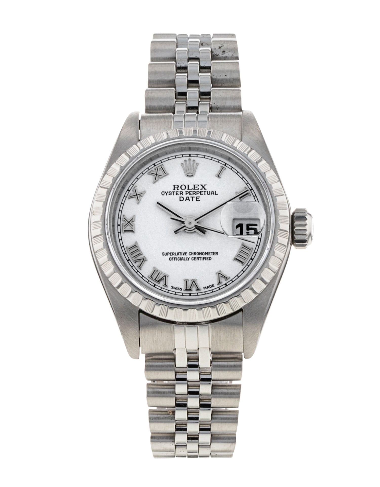 This Rolex Lady Oyster Perpetual 79240 has a white roman numeral dial and a bracelet strap. This Rolex has undergone a thorough inspection of water resistance, accuracy, functionality and condition to determine the level of reconditioning required to meet our strict standards. It has also been referenced against technical documents and manufacturer records where available to ensure authenticity and a clean history. All our watches have a 24-month warranty for your peace of mind. One of our skilled polishing technicians has removed marks on the case and bracelet of this watch, brought about by daily wear and tear, which is why this watch does not come with the remaining manufacturer’s warranty.