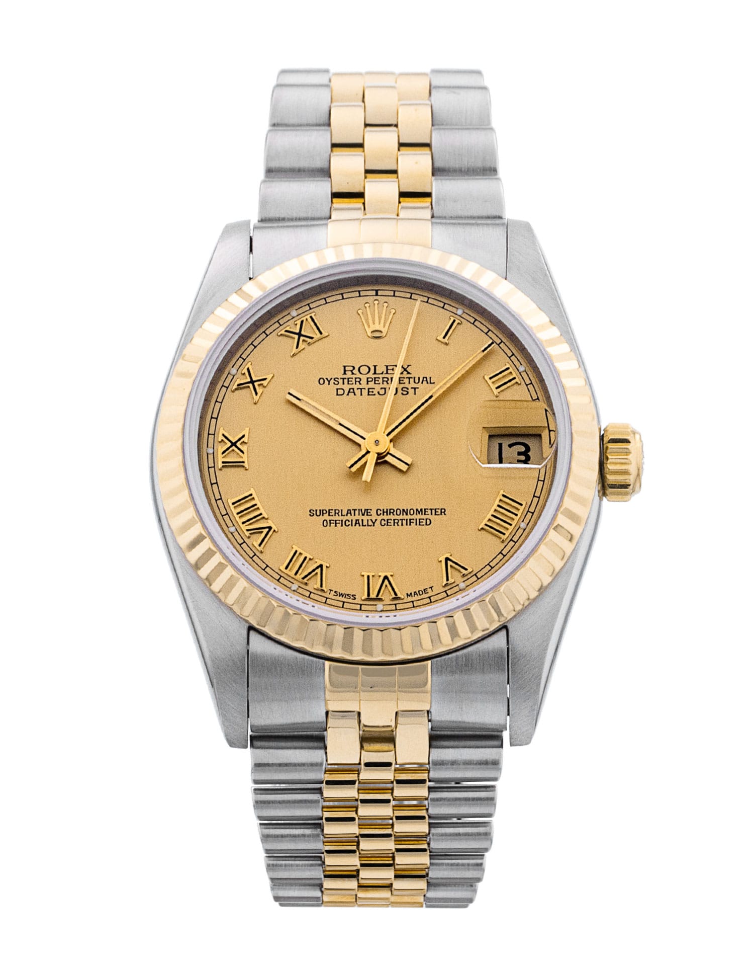 This Rolex Mid-Size Datejust 68273 has a champagne roman numeral dial and a bracelet strap. This Rolex has undergone a thorough inspection of water resistance, accuracy, functionality and condition to determine the level of reconditioning required to meet our strict standards. It has also been referenced against technical documents and manufacturer records where available to ensure authenticity and a clean history. All our watches have a 24-month warranty for your peace of mind. One of our skilled polishing technicians has removed marks on the case and bracelet of this watch, brought about by daily wear and tear, which is why this watch does not come with the remaining manufacturer’s warranty.