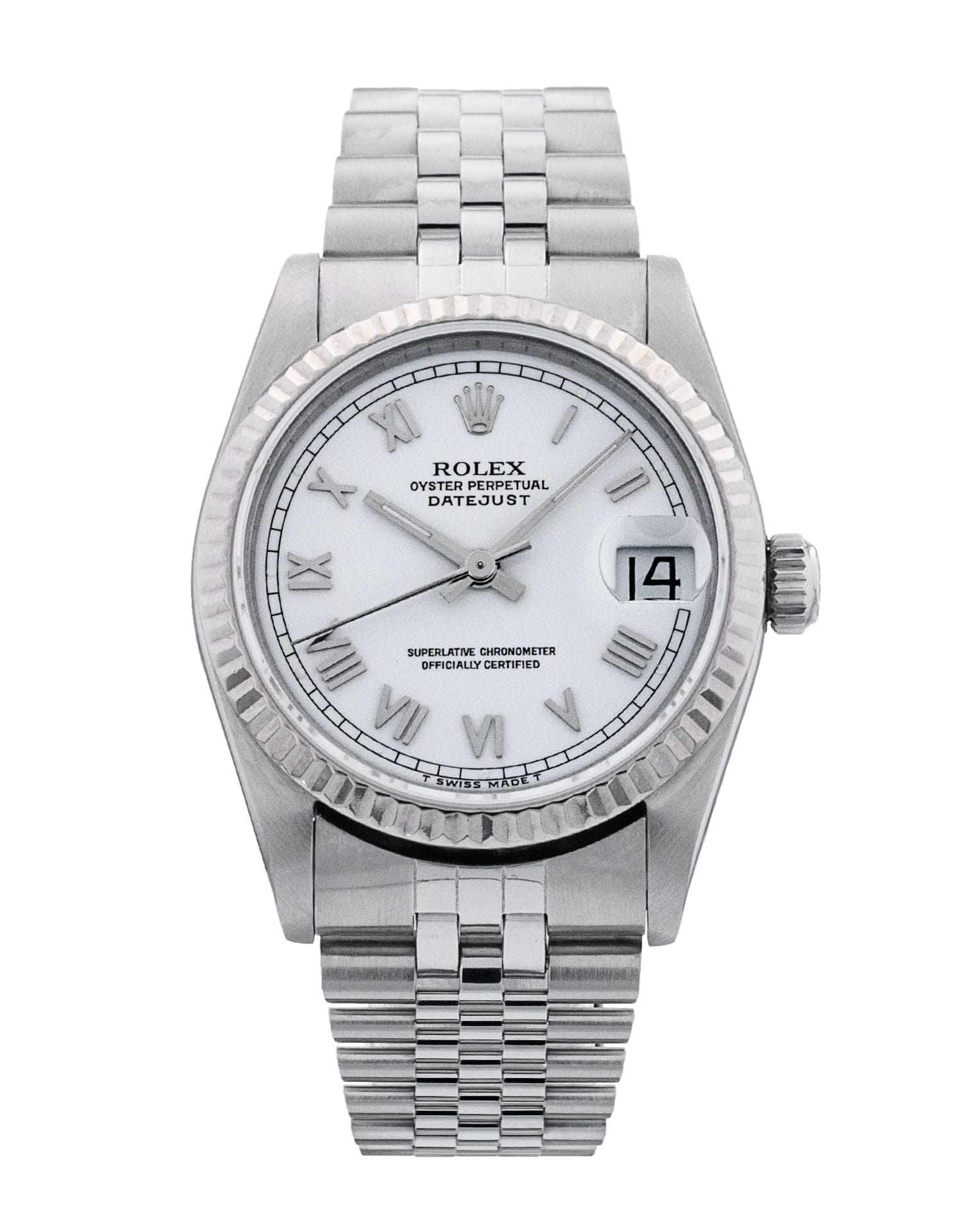 This Rolex Mid-Size Datejust 68274 has a white roman numeral dial and a bracelet strap. This Rolex has undergone a thorough inspection of accuracy, functionality and condition to determine the level of reconditioning required to meet our strict standards. It has also been referenced against technical documents and manufacturer records where available to ensure authenticity and a clean history. All our watches have a 24-month warranty for your peace of mind. One of our skilled polishing technicians has removed marks on the case and bracelet of this watch, brought about by daily wear and tear, which is why this watch does not come with the remaining manufacturer’s warranty.
