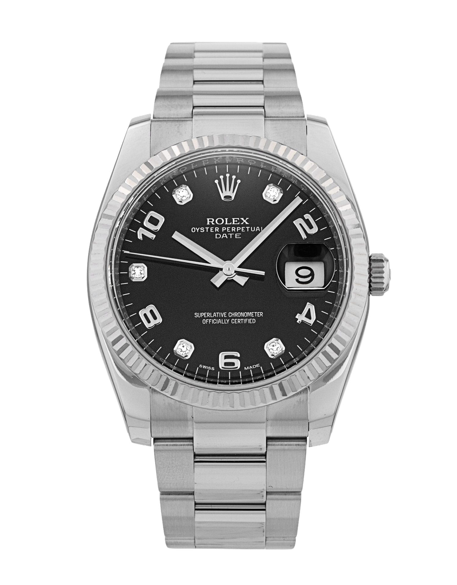 This Rolex Oyster Perpetual Date 115234 has a black diamond dial and a bracelet strap. This Rolex has undergone a thorough inspection of water resistance, accuracy, functionality and condition to determine the level of reconditioning required to meet our strict standards. It has also been referenced against technical documents and manufacturer records where available to ensure authenticity and a clean history. All our watches have a 24-month warranty for your peace of mind. One of our skilled polishing technicians has removed marks on the case and bracelet of this watch, brought about by daily wear and tear, which is why this watch does not come with the remaining manufacturer’s warranty.